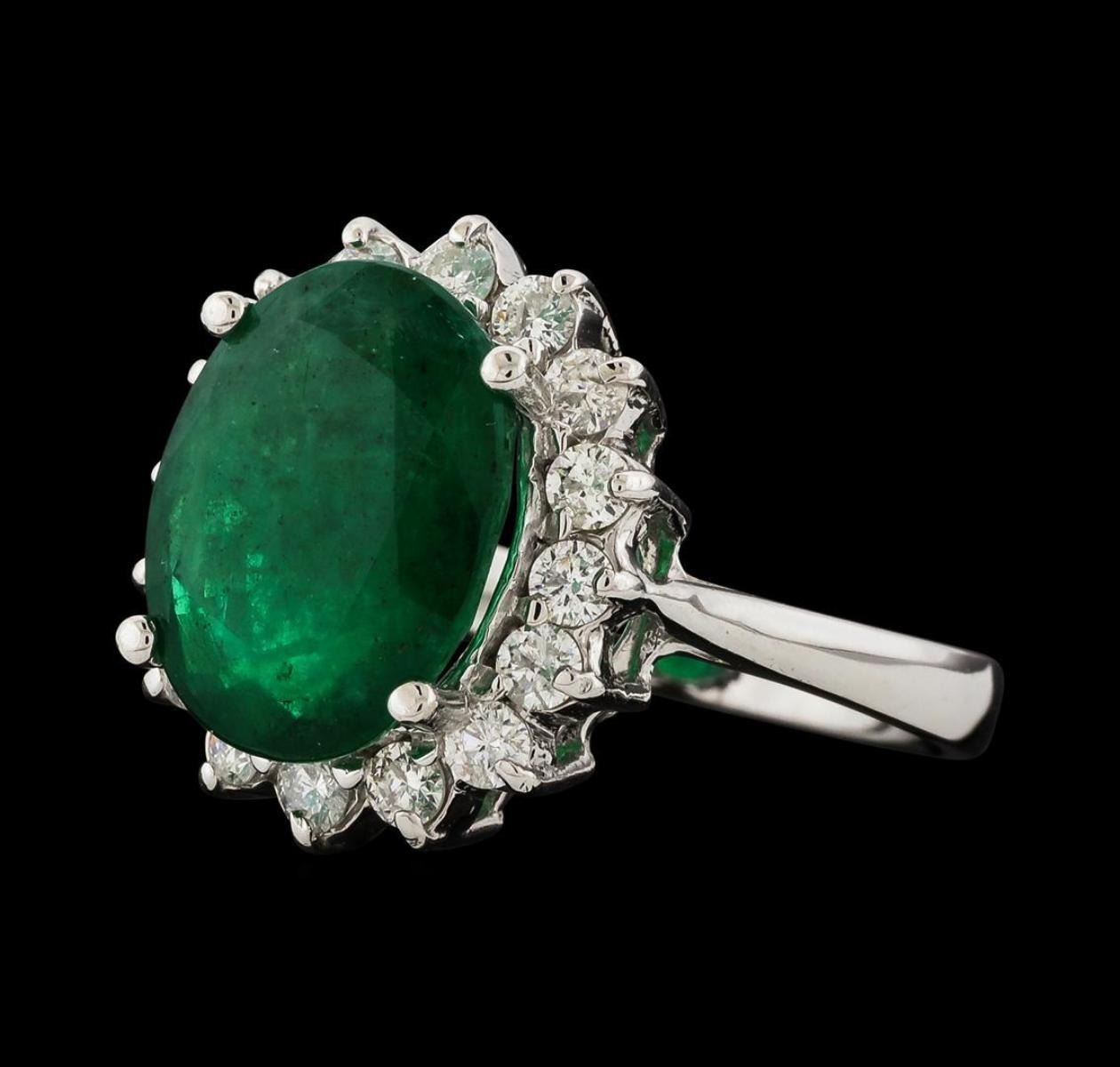 One electronically tested 14KT white gold lady's cast fashion ring with a basket halo with a bright polish finish. The featured lady's ring has a shank measuring 2.65 millimeters wide. Identified with markings of 'K14'. Condition is new, good workmanship. Containing: One prong set oval modified mixed cut natural emerald, measuring 12.62 x 9.47 x 5.44mm, (depth est.) 20%. bulge factor, approximate weight of 4.60ct., clarity is heavily included, medium dark, moderately strong, green color, (GIA G 6/4), cut is good. Transmitting light somewhat diffusely, semi-transparent to translucent. Naturally occurring internal & external characteristics are present. Indications of oil residue. Colored gemstones are presumed to have been subjected to commonly used enhancement processes. Graded in the setting. Sixteen prong set round brilliant cut diamonds, measuring 2.20 - 2.15 x 1.35mm (depth est.) approximate total weight of 16 Stones = 0.64ct. Graded in the setting. Clarity SI-1 to I-1. Color: G - H Cut Good. Total Weight of Colored Stones 4.60ct.. Total Weight of Diamonds 0.64ct.. Total Weight of Ring 4.80gm. GAS Appraised.
