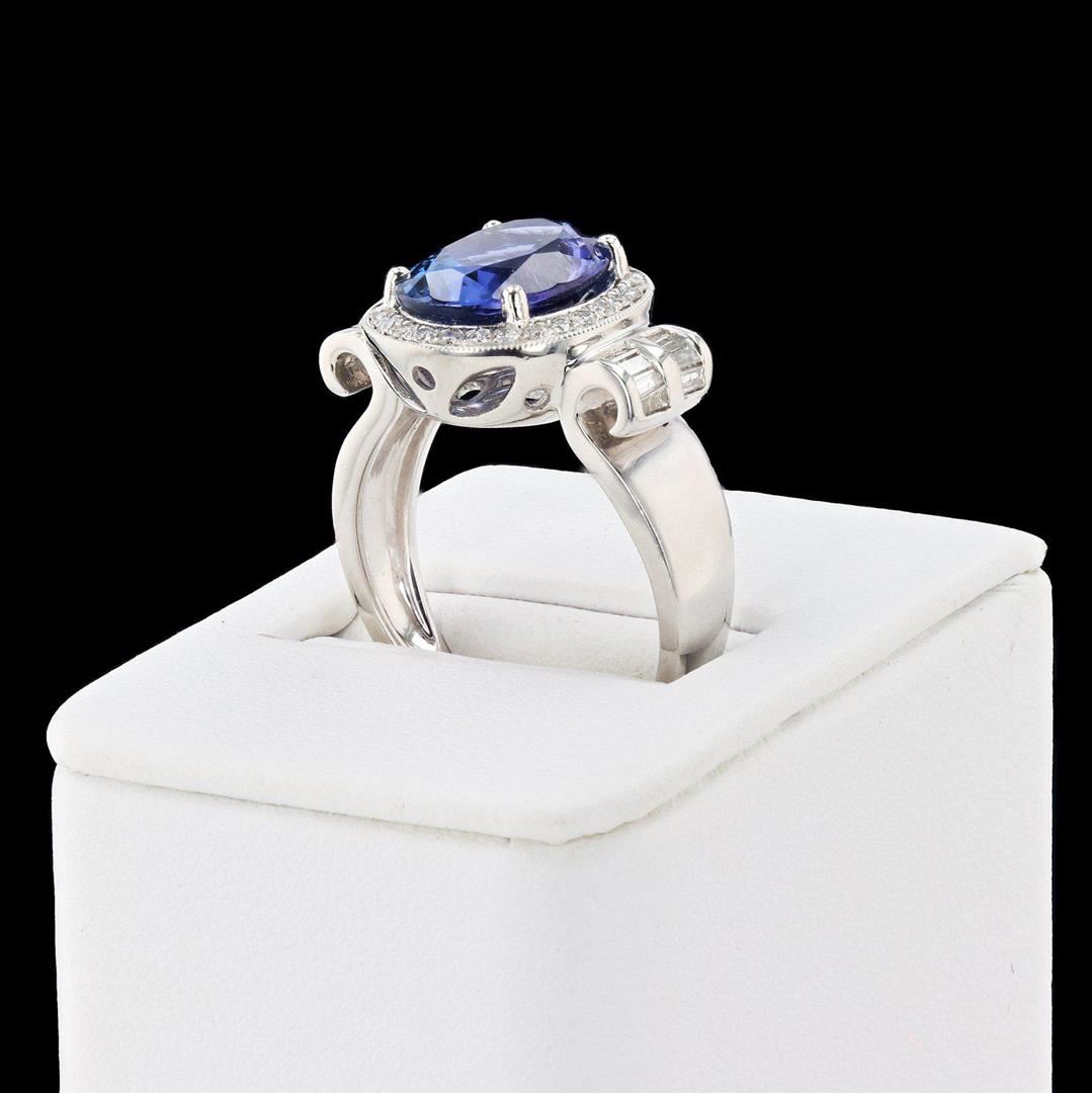 One electronically tested platinum ladies cast tanzanite & diamond ring. Condition is new, good workmanship. The featured tanzanite is set within a diamond bezel, supported by an elaborate lattice under gallery and diamond set shoulders, completed by a two millimeter wide band. Bright polish finish. Trademark is Orianne. Identified with markings of "PT950" Containing: One prong set oval mixed cut natural tanzanite, measuring 11.98 x 9.42 x 5.40mm, approximate weight of 4.63ct., clarity is eye clean, type I, medium dark, very slightly grayish, violetish blue color, (GIA vB 6/3), cut is good. Transmitting light with no distortion, transparent. Graded in the setting. Tanzanite is a very rare gemstone that is only found in the country of Tanzania. Originally discovered in 1967. It is found in the Usumburu Mountains that border the Umba Valley of northern Tanzania. Tanzanite occurs in gray, brown, violet, blue, reddish-purple, & green. The gem is interesting because of its exceptional pleochroism. Rotated in different directions a tanzanite will exhibit multiple changes of color. Tanzanite has a low tolerance to ultrasonic cleaning, and should not be cleaned using this method. Forty-four prong & channel set baguette & round brilliant cut diamonds approximate total weight of 44 Stones = 0.54ctw. The clarity & color grade reflect the overall average for the group. Graded in the setting. Clarity VS1 to SI1 Color G - H Total Weight of Colored Stones 4.63ct. Total Weight of Diamonds 0.54ctw. Total Weight of Ring 12.20 gm 4.63ct Tanzanite and 0.54ctw Diamond Platinum Ring