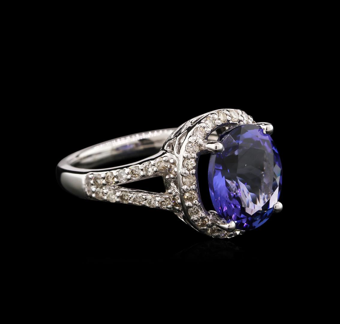 One electronically tested 14KT white gold ladies cast tanzanite and diamond ring with a bright polish finish. Identified with markings of "14K". Condition is new. Containing: One prong set oval modified brilliant cut natural tanzanite, measuring 10.70 x 10.10 x 6.10mm, approximate weight of 4.64ct., clarity is eye clean, type I, medium, moderately strong, bluish violet color, (GIA bV 5/4), cut is good. Fifty prong set round brilliant cut diamonds, measuring 1.50 - 1.50 x 0.90mm (depth est.) approximate. Total Weight of 50 Stones = 0.62ct. Clarity: SI-1 to SI-2. Color: H - I, Cut is Good. Colored gemstones are presumed to have been subjected to commonly used enhancement processes. All diamonds and colored gemstones are graded in the mounting, unless otherwise stated. Total Weight of Colored Stones 4.64ct. Total Weight of Diamonds 0.62ct. Total Weight of Ring 5.90 grams. GGL Appraised at $4,215.00.