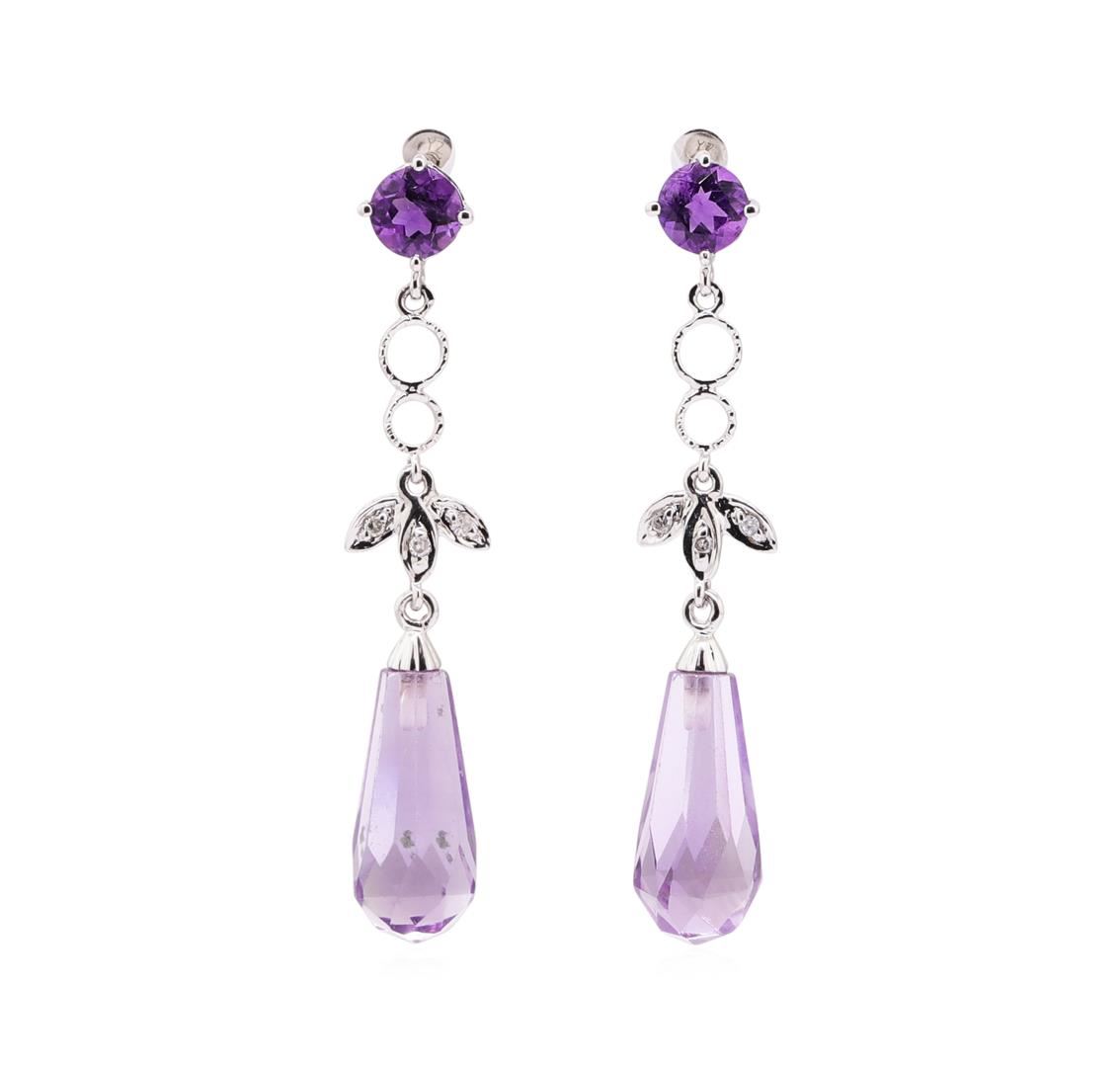 One pair of earrings featuring: 10KT white gold weighing 1.8 grams containing two briolette amethyst weighing 4.00 ctw, two round amethysts weighing 0.60 ctw and six white sapphires weighing 0.05ctw. The earrings have a drop of approximately 35 millimeters.