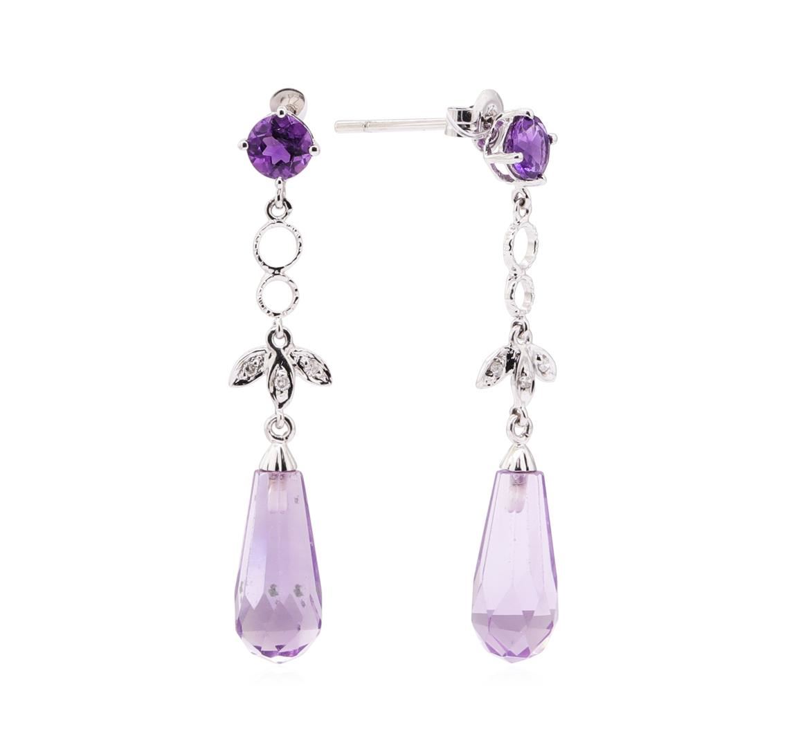One pair of earrings featuring: 10KT white gold weighing 1.8 grams containing two briolette amethyst weighing 4.00 ctw, two round amethysts weighing 0.60 ctw and six white sapphires weighing 0.05ctw. The earrings have a drop of approximately 35 millimeters.