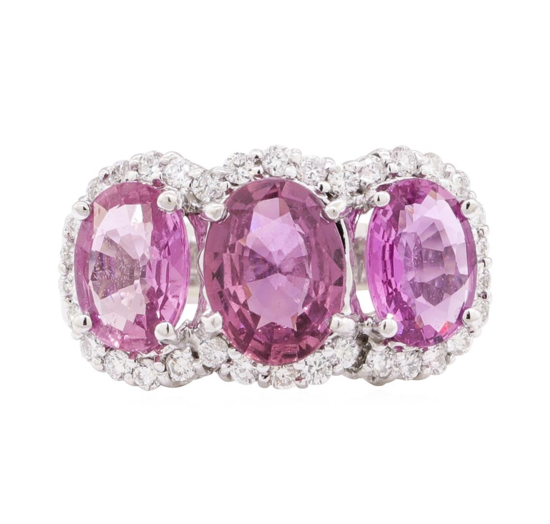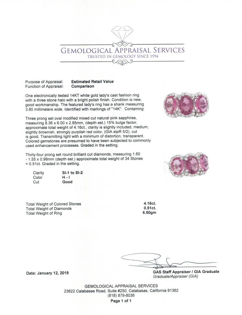 One electronically tested 14KT white gold lady's cast fashion ring with a three stone halo with a bright polish finish. The featured lady's ring has a shank measuring 3.80 millimeters wide. Identified with markings of '14K'. Condition is new, good workmanship. Containing: Three prong set oval modified mixed cut natural pink sapphires, measuring 8.36 x 6.00 x 2.85mm, (depth est.) 15%. bulge factor, approximate total weight of 4.16ct., clarity is slightly included, medium, slightly brownish, strongly purplish red color, (GIA stpR 5/2), cut is good. Transmitting light with a minimum of distortion, transparent. Colored gemstones are presumed to have been subjected to commonly used enhancement processes. Graded in the setting. Thirty-Four prong set round brilliant cut diamonds, measuring 1.60 - 1.55 x 0.98mm (depth est.) approximate total weight of 34 Stones = 0.51ct. Graded in the setting. Color H - I Clarity SI-1 to SI-2 Cut Good. Total Weight of Colored Stones 4.16ct.. Total Weight of Diamonds 0.51ct.. Total Weight of Ring 6.50gm GAS Appraised at $5990.00. GAS Appraised.