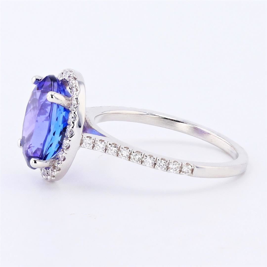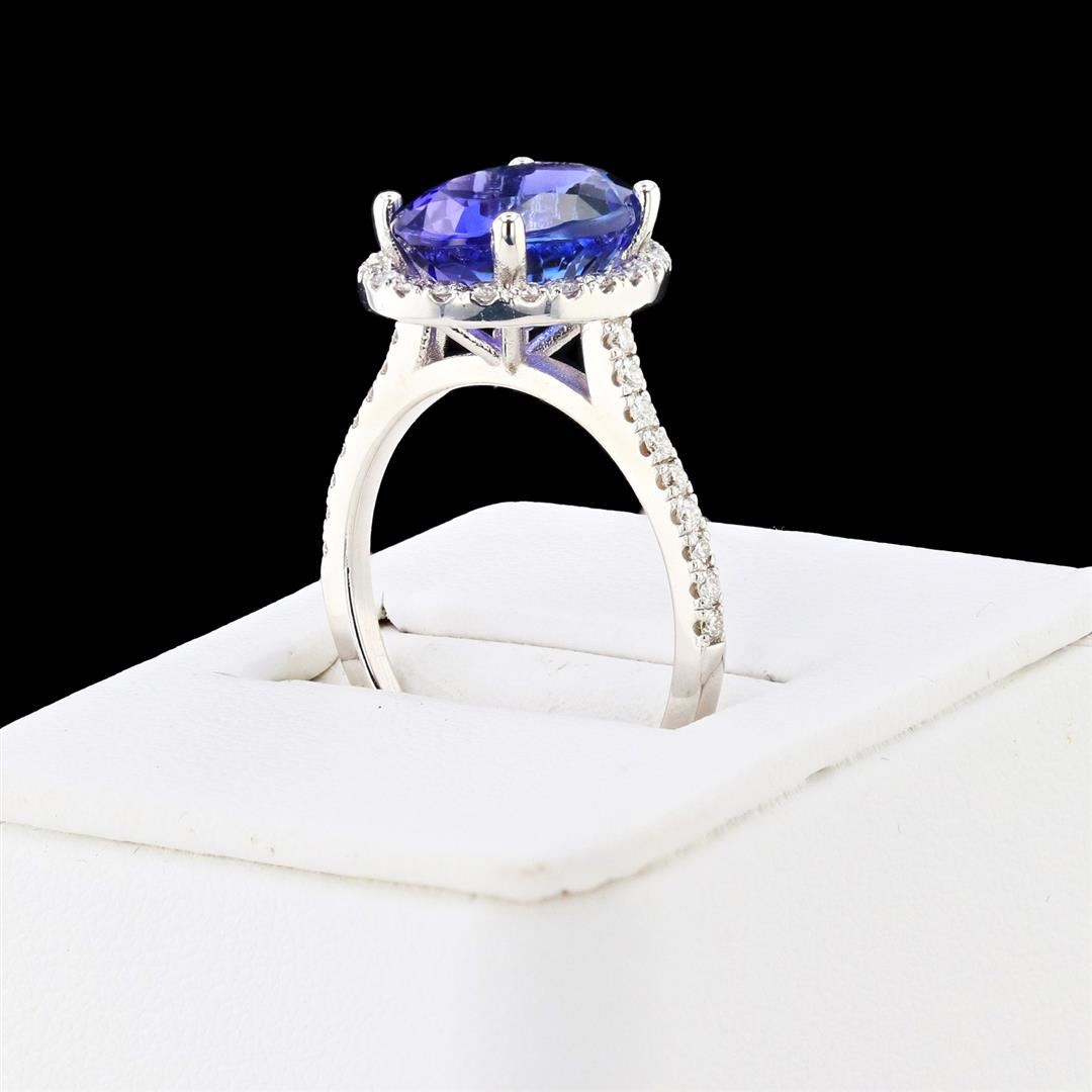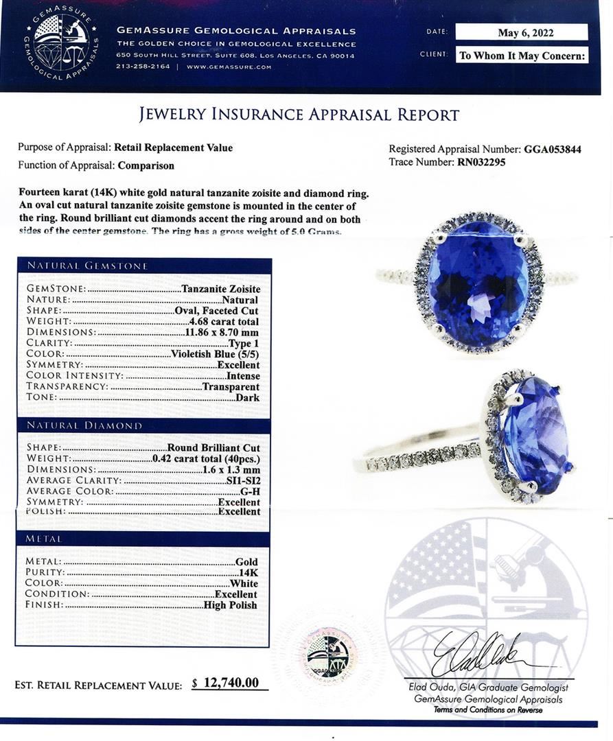 Fourteen karat (14K) white gold natural tanzanite zoisite and diamond ring. An oval cut natural tanzanite zoisite gemstone is mounted in the center of the ring. Round brilliant cut diamonds accent the ring around and on both sides of the center gemstone. The ring has a gross weight of 5.0 Grams: NATURAL GEMSTONE. GEMSTONE: Tanzanite Zoisite NATURE: Natural SHAPE: Oval, Faceted Cut WEIGHT: 4.68 carat total DIMENSIONS: 11.86 x 8.70mm CLARITY: Type 1 COLOR: Violetish Blue (5/5) SYMMETRY: Excellent COLOR INTENSITY: Intense TRANSPARENCY: Transparent TONE: Dark NATURAL DIAMOND SHAPE: Round Brilliant Cut WEIGHT: 0.42 carat total (40pcs.) DIMENSIONS: 1.6 x 1.3mm AVERAGE CLARITY: SI1 to SI2 AVERAGE COLOR: G - H SYMMETRY: Excellent POLISH: Excellent METAL: Gold PURITY: 14K COLOR: White CONDITION: Excellent FINISH: High Polish