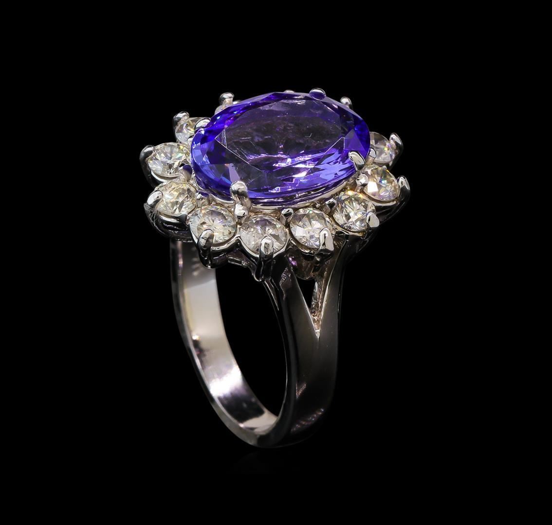 One electronically tested 14KT white gold lady's cast fashion ring with a basket halo with a bright polish finish. The featured lady's ring has a shank measuring 2.82 millimeters wide. Identified with markings of '14K'. Condition is new, good workmanship. Containing: One prong set oval modified brilliant cut natural tanzanite, measuring 13.11 x 9.10 x 5.07mm, (depth est.) 8%. bulge factor, approximate weight of 4.68ct., clarity is eye clean, medium, moderately strong, violetish blue color, (GIA vB 5/4), cut is very good. Transmitting light with no distortion, transparent. Colored gemstones are presumed to have been subjected to commonly used enhancement processes. Graded in the setting. Twelve prong set round brilliant cut diamonds, measuring 3.35 - 3.25 x 2.05mm (depth est.) approximate total weight of 12 Stones = 1.62ct. Graded in the setting. Clarity SI-1 to SI-2. Color: I - J Cut Very Good. Total Weight of Colored Stones 4.68ct.. Total Weight of Diamonds 1.62ct.. Total Weight of Ring 8.30gm