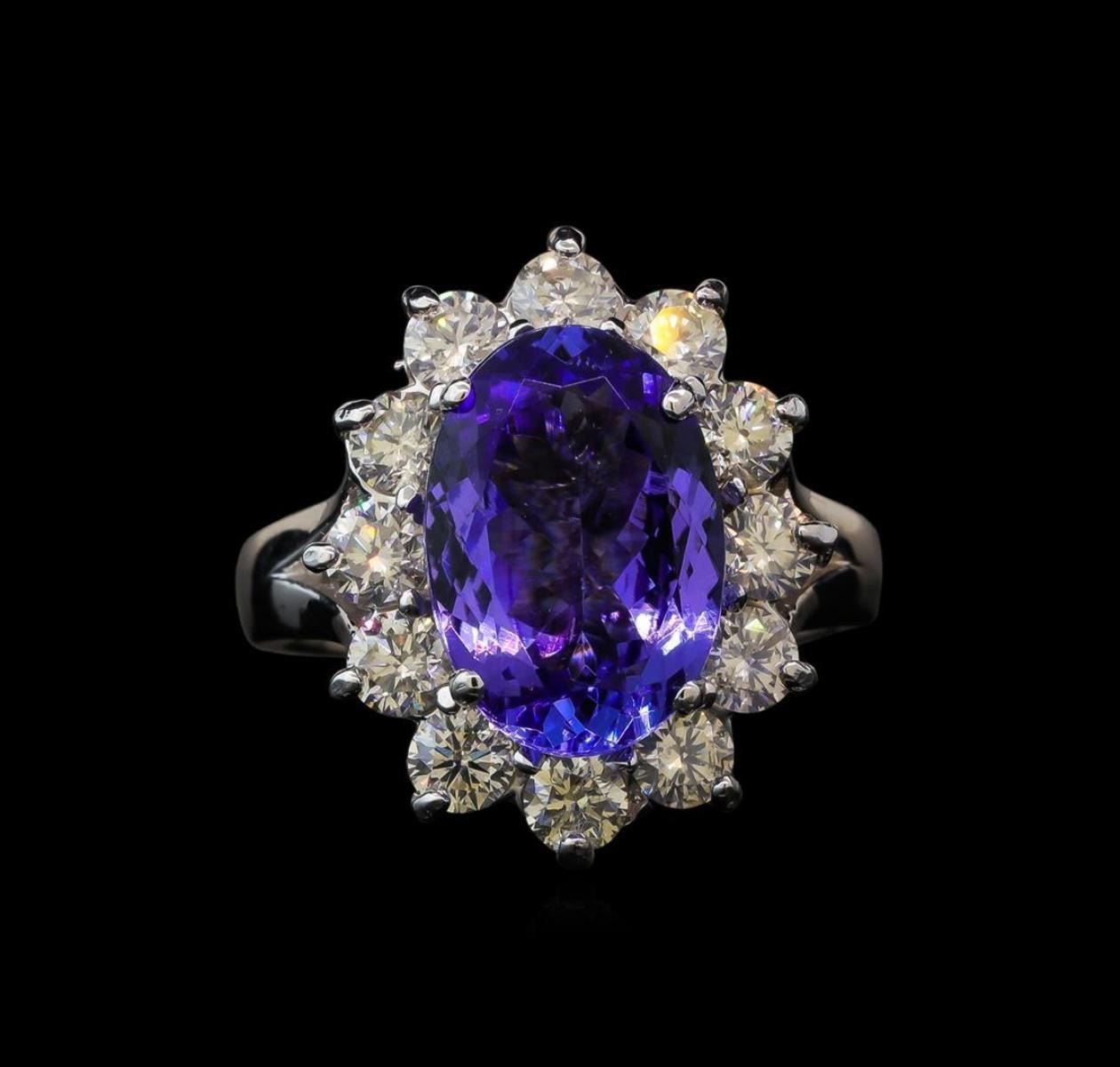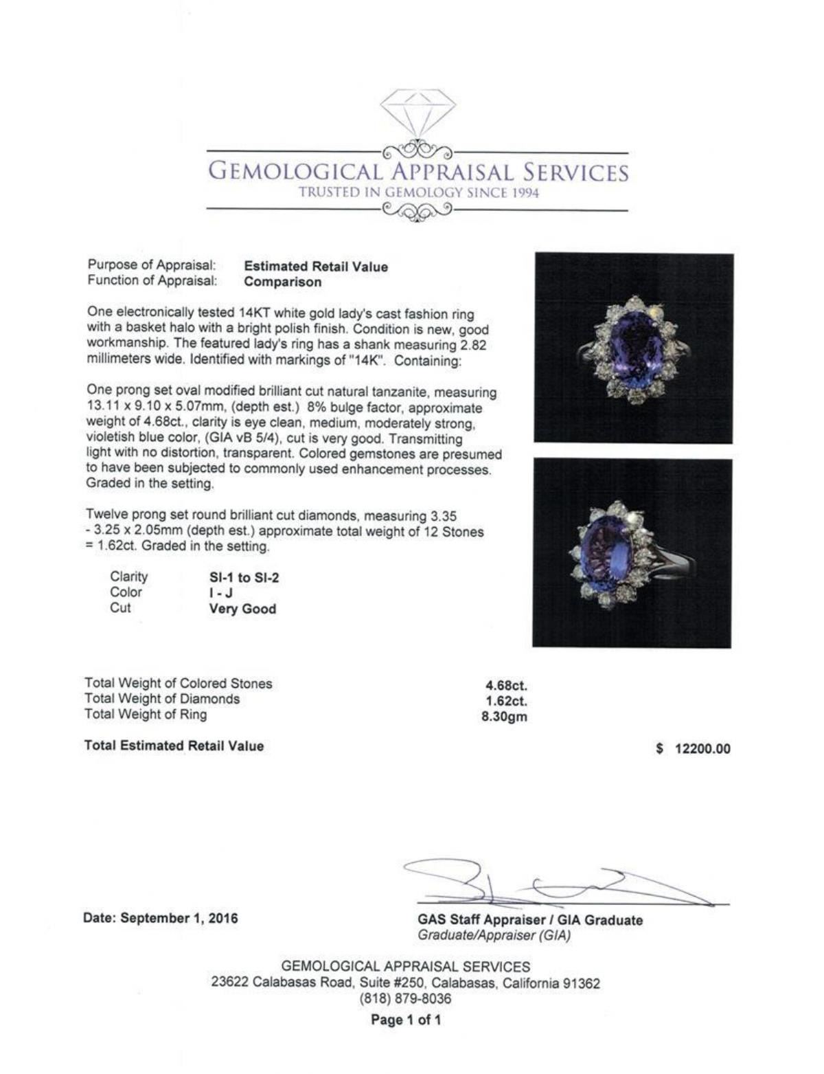 One electronically tested 14KT white gold lady's cast fashion ring with a basket halo with a bright polish finish. The featured lady's ring has a shank measuring 2.82 millimeters wide. Identified with markings of '14K'. Condition is new, good workmanship. Containing: One prong set oval modified brilliant cut natural tanzanite, measuring 13.11 x 9.10 x 5.07mm, (depth est.) 8%. bulge factor, approximate weight of 4.68ct., clarity is eye clean, medium, moderately strong, violetish blue color, (GIA vB 5/4), cut is very good. Transmitting light with no distortion, transparent. Colored gemstones are presumed to have been subjected to commonly used enhancement processes. Graded in the setting. Twelve prong set round brilliant cut diamonds, measuring 3.35 - 3.25 x 2.05mm (depth est.) approximate total weight of 12 Stones = 1.62ct. Graded in the setting. Clarity SI-1 to SI-2. Color: I - J Cut Very Good. Total Weight of Colored Stones 4.68ct.. Total Weight of Diamonds 1.62ct.. Total Weight of Ring 8.30gm