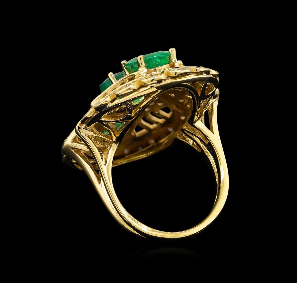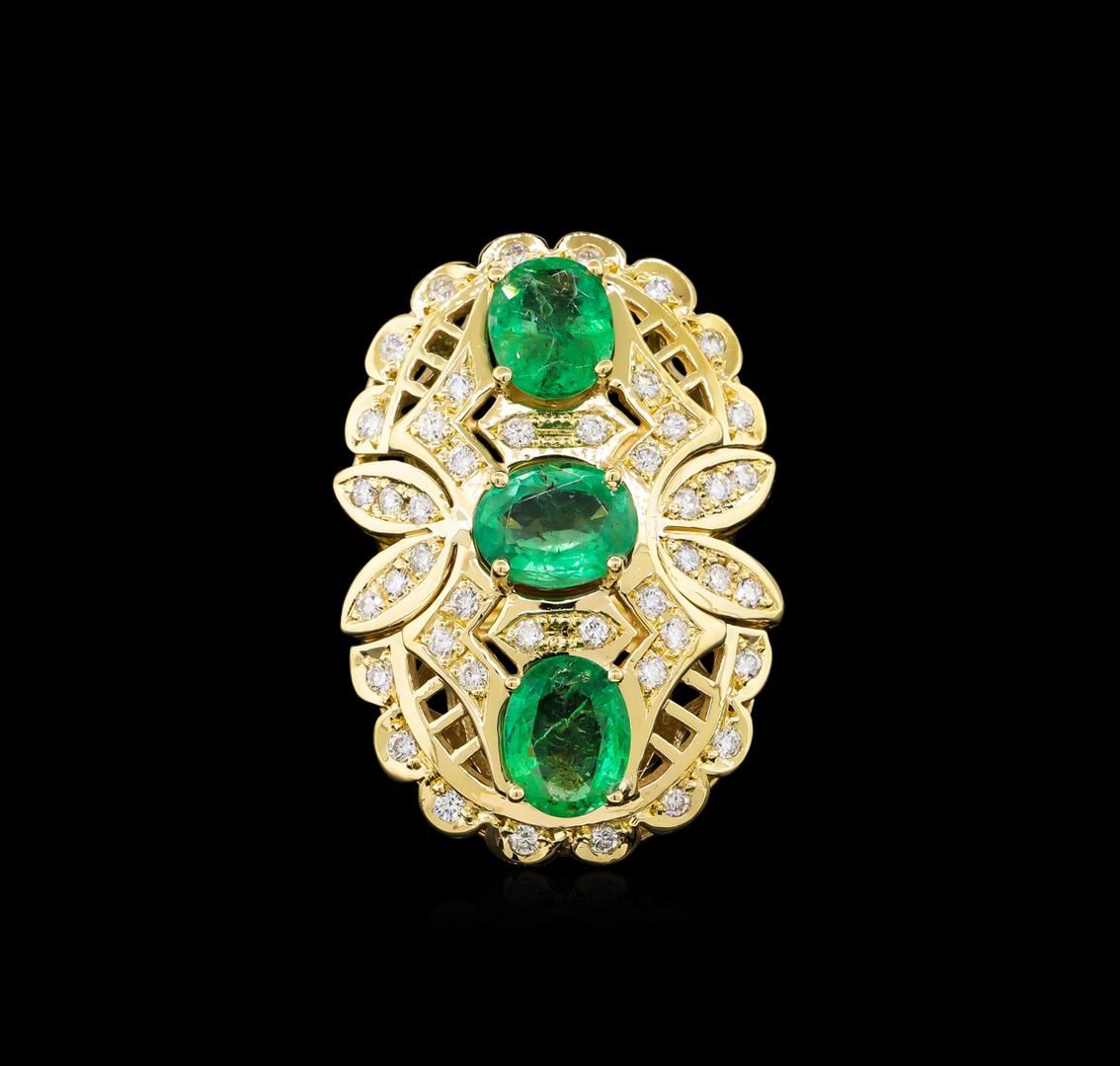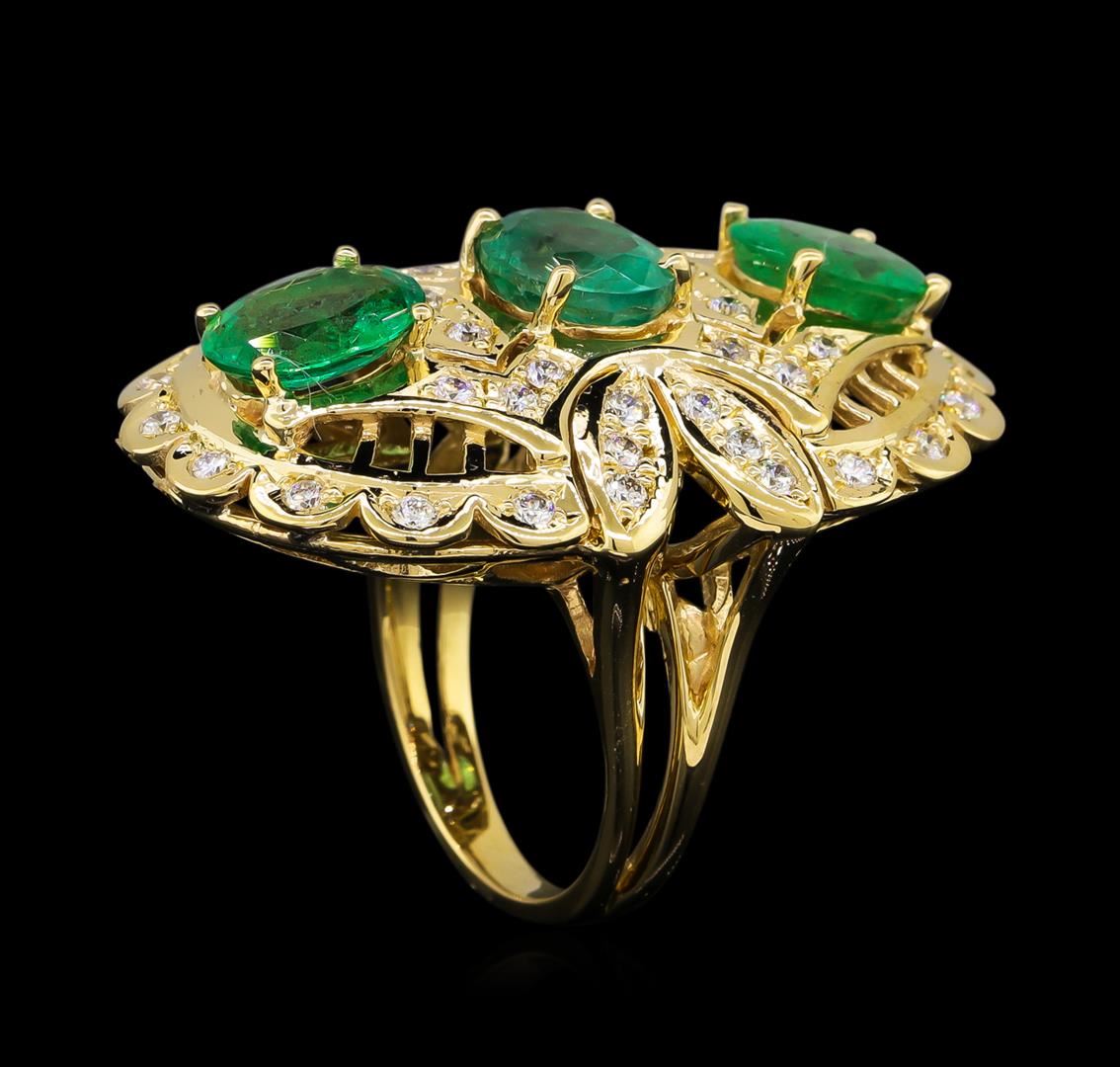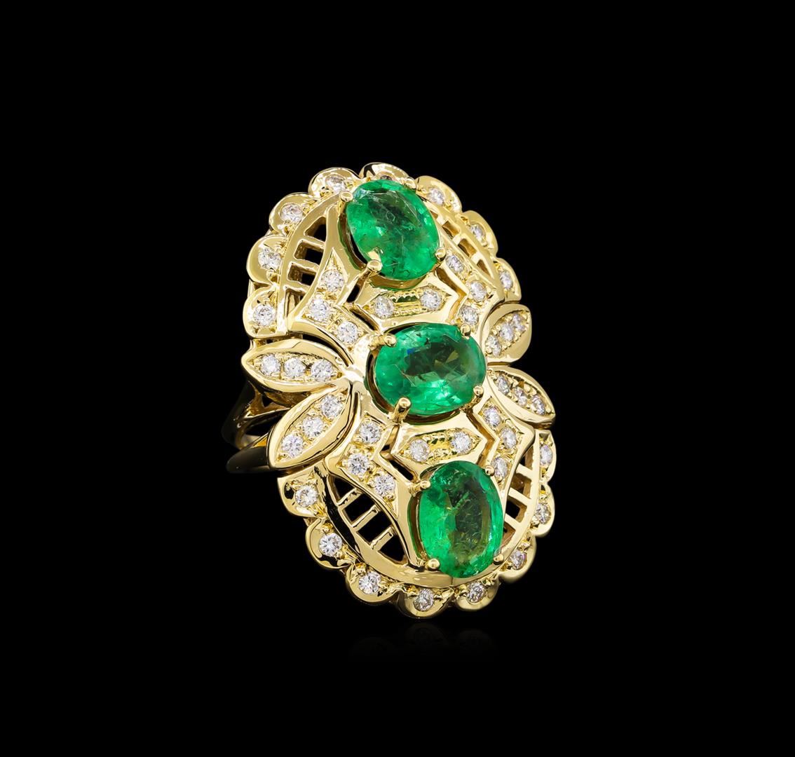 One electronically tested 14KT yellow gold ladies cast emerald and diamond ring. The ring features three emeralds set within an elaborate diamond gallery supported by split shoulders, completed by a two millimeter wide band. Bright polish and patterned finish. Condition is new, good workmanship. Containing: Three prong set oval mixed cut natural emeralds, measuring 9.00 x 7.00 x 4.00mm, approximate total weight of 4.70ct., clarity is moderately included, type III, medium, very slightly grayish, very slightly bluish green color, (GIA vslbG 5/3), cut is good. Transmitting light with a minimum of distortion, transparent. Naturally occurring internal & external characteristics are present. Indications of oil residue. Measurements & the color grade are an average for the group. Graded in the setting. Forty-Four prong set round brilliant cut diamonds approximate total weight of 44 Stones = 0.90ct. Graded in the setting. Clarity: SI-1 to I-1. Color: E - F. Total Weight of Colored Stones 4.70ct. Total Weight of Diamonds 0.90ct. Total Weight of Ring 14.00gm. AIG Appraised.
