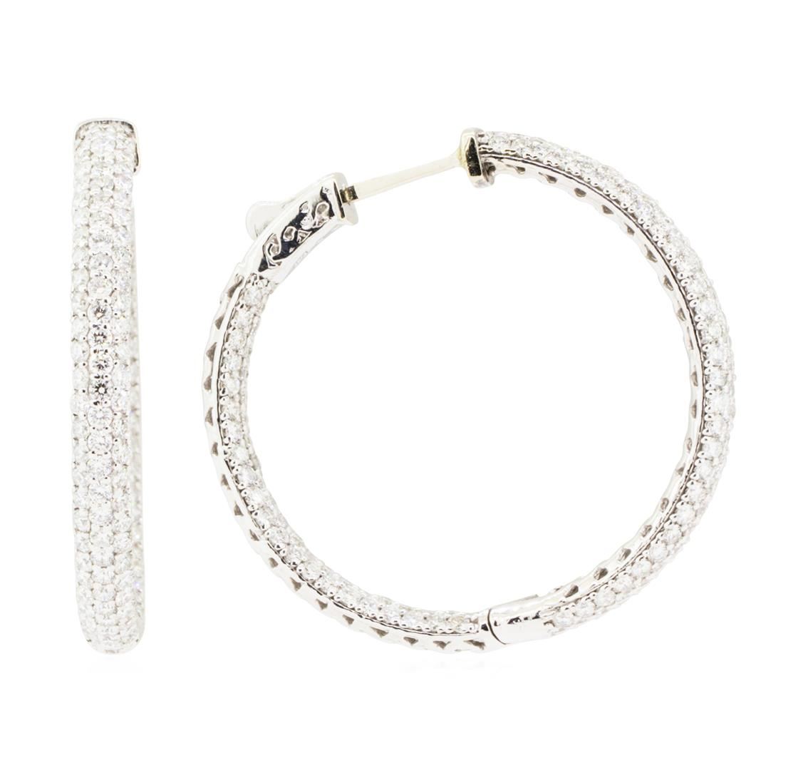 One electronically tested 14KT white gold lady's combination cast & assembled fashion hoop inside / outside earrings with hinged, snap locking posts with a bright polish finish. The featured lady's inside / outside hoop earrings have a diameter measuring 38 millimeters. Identified with markings of '14K'. Condition is new, good workmanship. Containing: Three Hundred Four prong set round brilliant cut diamonds, measuring 1.70 - 1.55 x 0.96mm (depth est.) approximate total weight of 304 Stones = 4.70ct. Graded in the setting. Color G - I Clarity SI-1 to SI-2 Cut Very Good. Total Weight of Diamonds 4.70ct.. Total Weight of Inside / Outside Earrings 11.80gm GAS Appraised at $14960.00. GAS Appraised.
