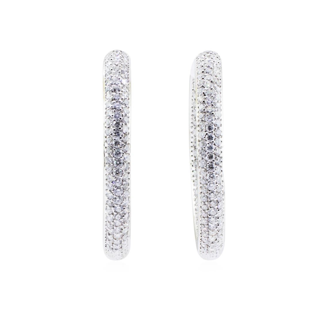 One electronically tested 14KT white gold lady's combination cast & assembled fashion hoop inside / outside earrings with hinged, snap locking posts with a bright polish finish. The featured lady's inside / outside hoop earrings have a diameter measuring 38 millimeters. Identified with markings of '14K'. Condition is new, good workmanship. Containing: Three Hundred Four prong set round brilliant cut diamonds, measuring 1.70 - 1.55 x 0.96mm (depth est.) approximate total weight of 304 Stones = 4.70ct. Graded in the setting. Color G - I Clarity SI-1 to SI-2 Cut Very Good. Total Weight of Diamonds 4.70ct.. Total Weight of Inside / Outside Earrings 11.80gm GAS Appraised at $14960.00. GAS Appraised.