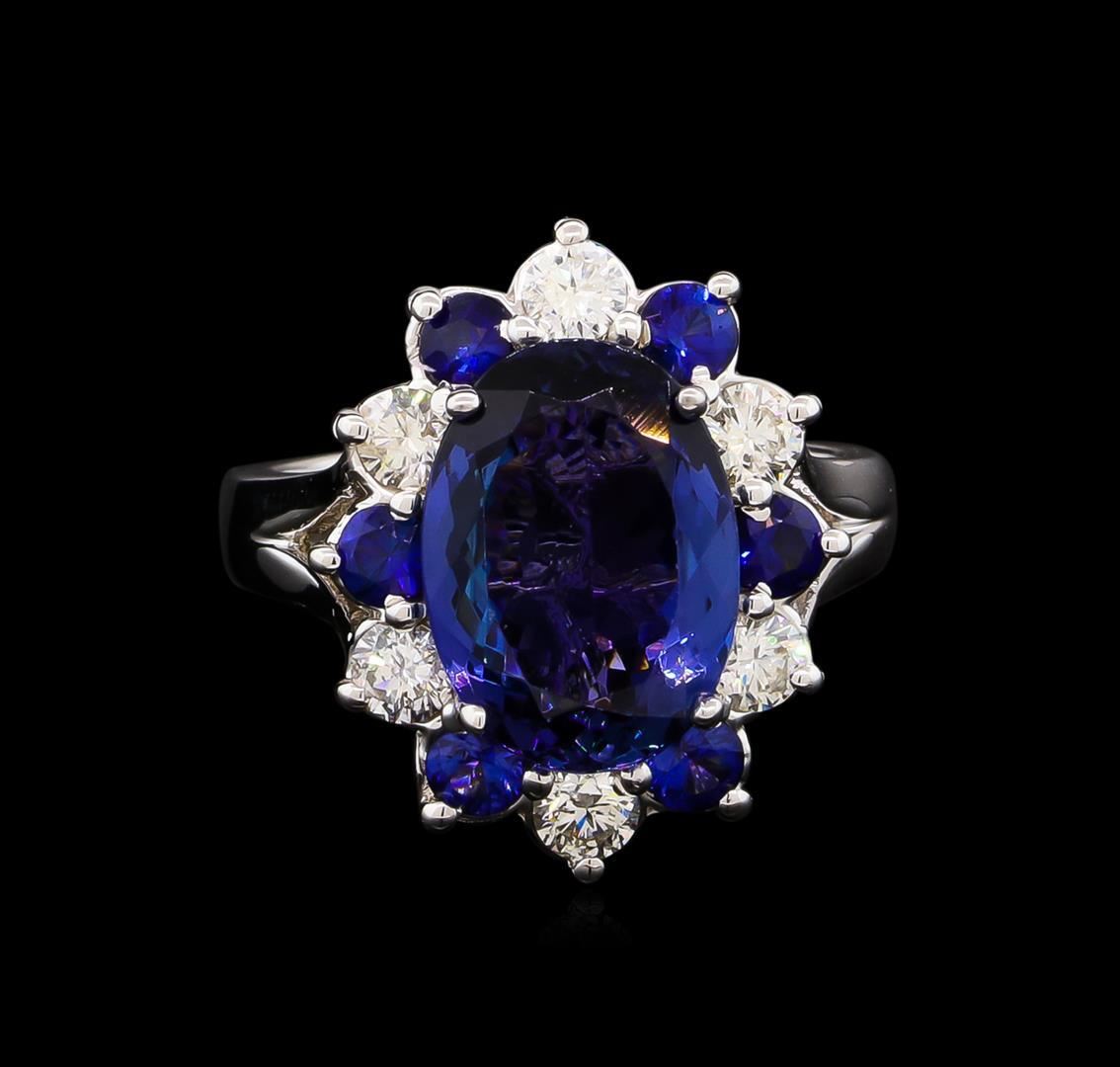 One electronically tested 14KT white gold lady's cast fashion ring with a split shank basket halo with a bright polish finish. The featured lady's ring has a shank measuring 2.88 millimeters wide. Identified with markings of "14K". Condition is new, good workmanship. Containing: One prong set oval modified brilliant cut natural tanzanite, measuring 12.56 x 9.17 x 4.85mm, 20%. bulge factor, approximate weight of 4.70ct., clarity is eye clean, type I, medium, moderately strong, bluish violet color, (GIA bV 5/4), cut is very good. Transmitting light with no distortion, transparent. Colored gemstones are presumed to have been subjected to commonly used enhancement processes. Graded in the setting. Six prong set round modified brilliant cut natural blue sapphires, measuring 3.00 - 2.90 x 1.92 mm, approximate total weight of 0.80ct., clarity is eye clean, type II, medium dark, moderately strong, blue color, (GIA B 6/4), cut is very good. Transmitting light with no distortion, transparent. Colored gemstones are presumed to have been subjected to commonly used enhancement processes. Graded in the setting. Six prong set round brilliant cut diamonds, measuring 3.10 - 3.00 x 1.89mm (depth est.) approximate total weight of 6 Stones = 0.65ct. Graded in the setting. Clarity: SI-1 to SI-2. Color: H - I. Cut Good. Total Weight of Colored Stones 5.50ct. Total Weight of Diamonds 0.65ct. Total Weight of Ring 7.40gm. GAS Appraised.