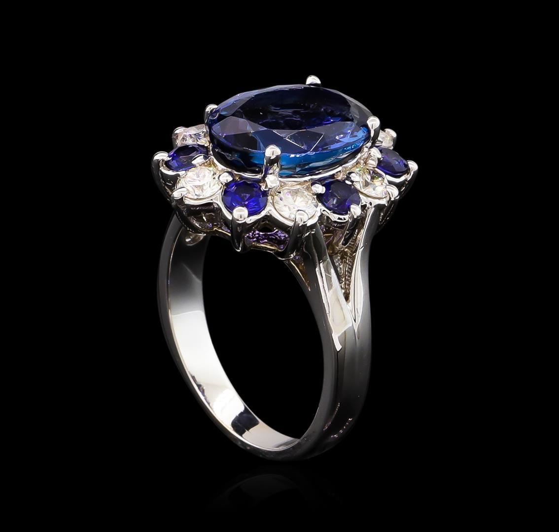 One electronically tested 14KT white gold lady's cast fashion ring with a split shank basket halo with a bright polish finish. The featured lady's ring has a shank measuring 2.88 millimeters wide. Identified with markings of "14K". Condition is new, good workmanship. Containing: One prong set oval modified brilliant cut natural tanzanite, measuring 12.56 x 9.17 x 4.85mm, 20%. bulge factor, approximate weight of 4.70ct., clarity is eye clean, type I, medium, moderately strong, bluish violet color, (GIA bV 5/4), cut is very good. Transmitting light with no distortion, transparent. Colored gemstones are presumed to have been subjected to commonly used enhancement processes. Graded in the setting. Six prong set round modified brilliant cut natural blue sapphires, measuring 3.00 - 2.90 x 1.92 mm, approximate total weight of 0.80ct., clarity is eye clean, type II, medium dark, moderately strong, blue color, (GIA B 6/4), cut is very good. Transmitting light with no distortion, transparent. Colored gemstones are presumed to have been subjected to commonly used enhancement processes. Graded in the setting. Six prong set round brilliant cut diamonds, measuring 3.10 - 3.00 x 1.89mm (depth est.) approximate total weight of 6 Stones = 0.65ct. Graded in the setting. Clarity: SI-1 to SI-2. Color: H - I. Cut Good. Total Weight of Colored Stones 5.50ct. Total Weight of Diamonds 0.65ct. Total Weight of Ring 7.40gm. GAS Appraised.