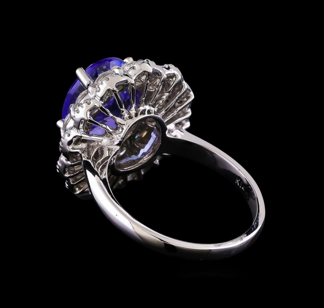 One electronically tested 14KT white gold lady's cast fashion ring with a scallop double basket halo with a bright polish finish. The featured lady's has a shank measuring 2.22 millimeters in width. Identified with markings of "K14". Condition is new, good workmanship. Containing: One prong set oval modified brilliant cut natural tanzanite, measuring 11.18 x 8.71 x 5.91mm, (depth est.) 15%. bulge factor, approximate weight of 4.70ct., clarity is eye clean, medium, moderately strong, bluish violet color, (GIA bV 5/4), cut is very good. Transmitting light with no distortion, transparent. Colored gemstones are presumed to have been subjected to commonly used enhancement processes. Graded in the setting. Twelve prong set round brilliant cut diamonds, measuring 3.05 - 3.00 x 1.88mm (depth est.) approximate total weight of 12 Stones = 1.25ct. Graded in the setting. Clarity: VS-2 to SI-1. Color: H - I. Cut Very Good Thirty-Six prong set round brilliant cut diamonds, measuring 1.40 - 1.35 x 0.86mm (depth est.) approximate total weight of 36 Stones = 0.37ct. Graded in the setting. Clarity: SI-1 to SI-2. Color: G - Good. Total Weight of Colored Stones 4.70ct. Total Weight of Diamonds 1.62ct. Total Weight of Ring 8.00gm. GAS Appraised.