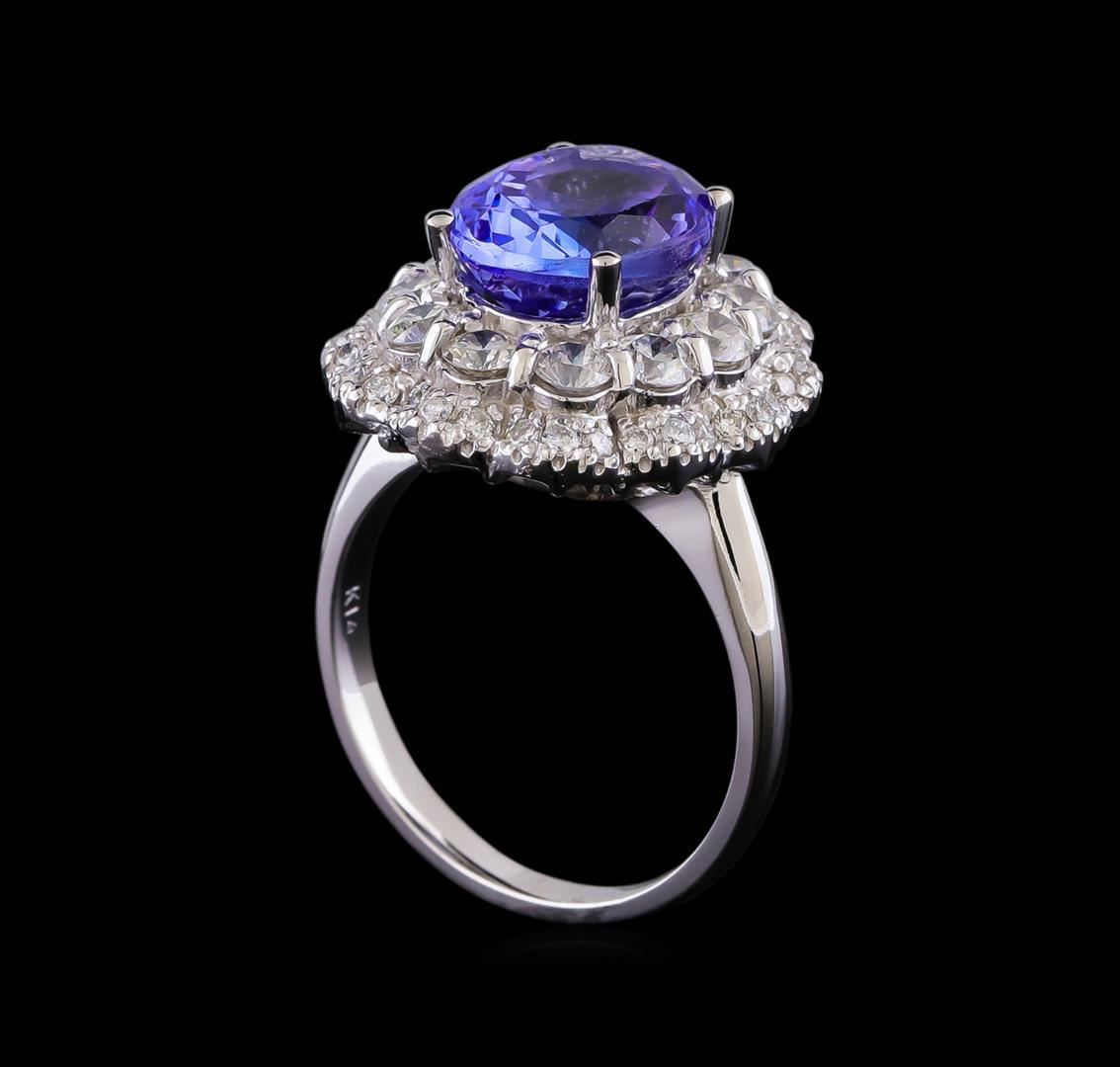 One electronically tested 14KT white gold lady's cast fashion ring with a scallop double basket halo with a bright polish finish. The featured lady's has a shank measuring 2.22 millimeters in width. Identified with markings of "K14". Condition is new, good workmanship. Containing: One prong set oval modified brilliant cut natural tanzanite, measuring 11.18 x 8.71 x 5.91mm, (depth est.) 15%. bulge factor, approximate weight of 4.70ct., clarity is eye clean, medium, moderately strong, bluish violet color, (GIA bV 5/4), cut is very good. Transmitting light with no distortion, transparent. Colored gemstones are presumed to have been subjected to commonly used enhancement processes. Graded in the setting. Twelve prong set round brilliant cut diamonds, measuring 3.05 - 3.00 x 1.88mm (depth est.) approximate total weight of 12 Stones = 1.25ct. Graded in the setting. Clarity: VS-2 to SI-1. Color: H - I. Cut Very Good Thirty-Six prong set round brilliant cut diamonds, measuring 1.40 - 1.35 x 0.86mm (depth est.) approximate total weight of 36 Stones = 0.37ct. Graded in the setting. Clarity: SI-1 to SI-2. Color: G - Good. Total Weight of Colored Stones 4.70ct. Total Weight of Diamonds 1.62ct. Total Weight of Ring 8.00gm. GAS Appraised.