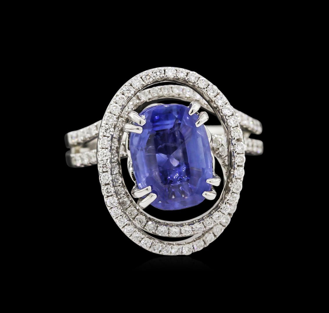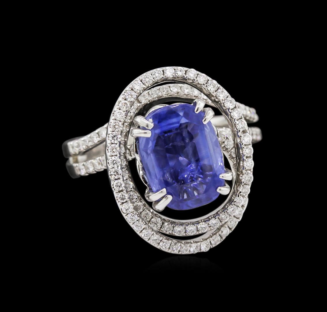 One electronically tested 18KT white gold lady's combination cast & assembled fashion ring with a split shank swirled halo with a bright polish finish. The featured lady's ring has a shank measuring 3.39 millimeters wide. Identified with markings of "18K". Condition is new, good workmanship. Containing: One prong set rectangular cushion modified mixed cut natural blue sapphire, measuring 10.66 x 7.79 x 5.18mm, 10%. bulge factor, approximate weight of 4.72ct., clarity is moderately included, type II, medium light, moderately strong, violetish blue color, (GIA vB 4/4), cut is very good. Colored gemstones are presumed to have been subjected to commonly used enhancement processes. Graded in the setting. One Hundred Ten prong set round brilliant cut diamonds, measuring 1.25 - 1.20 x 0.76mm (depth est.) approximate total weight of 110 Stones = 0.77ct. Graded in the setting. Clarity: VS-2 to SI-2. Color: G - I. Cut Good. Total Weight of Colored Stones 4.72ct. Total Weight of Diamonds 0.77ct. Total Weight of Ring 9.10gm. GAS Appraised at $15,050.00.