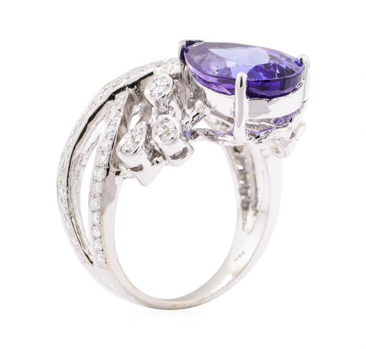 One electronically tested 14KT white gold lady's cast fashion ring with a split shank with a bright polish finish. The featured lady's ring has a tiara motif and a shank measuring 3.00 millimeters wide. Identified with markings of '14K'. Condition is new, good workmanship. Containing: One prong set pear modified mixed cut natural tanzanite, measuring 14.25 x 8.06 x 5.81mm, (depth est.) approximate weight of 4.55ct., clarity is eye clean, medium dark, very slightly grayish, violetish blue color, (GIA vB 6/3), cut is good. Transmitting light with no distortion, transparent. Colored gemstones are presumed to have been subjected to commonly used enhancement processes. Graded in the setting. Six prong set round brilliant cut diamonds, measuring 2.00 - 1.90 x 1.21mm (depth est.) approximate total weight of 6 Stones = 0.17ct. Graded in the setting. Color G - H Clarity SI-1 to SI-2 Cut Very Good Fifty-Nine prong set round brilliant cut diamonds, measuring 1.30 - 1.25 x 0.79mm (depth est.) approximate total weight of 59 Stones = 0.44ct. Graded in the setting. Color G - H Clarity SI-1 to SI-2 Cut Very Good Six prong set round brilliant cut diamonds, measuring 1.20 - 1.15 x 0.73mm (depth est.) approximate total weight of 6 Stones = 0.04ct. Graded in the setting. Color H - I Clarity SI-1 to SI-2 Cut Good. Total Weight of Colored Stones 4.55ct.. Total Weight of Diamonds 0.65ct.. Total Weight of Ring 9.10gm GAS Appraised at $8885.00. GAS Appraised.