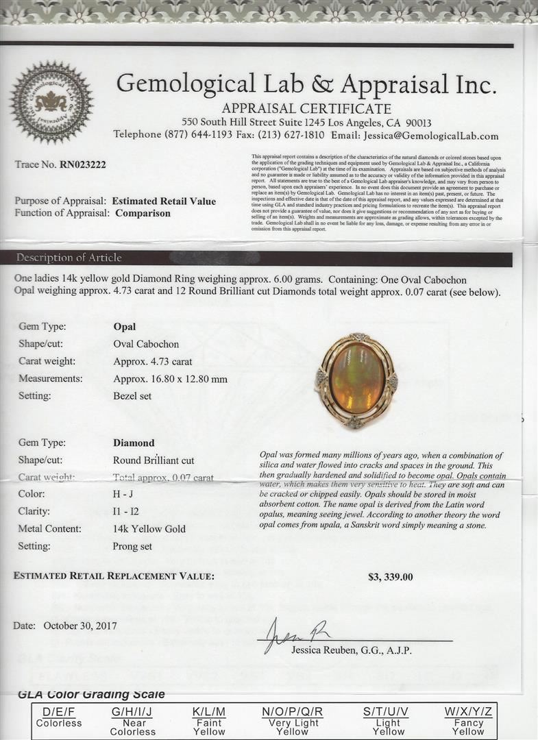 One 4.73ct Opal and Diamond Ring - 14KT Yellow Gold. GLA certified. See Appraisal for more details. GLA Appraised.