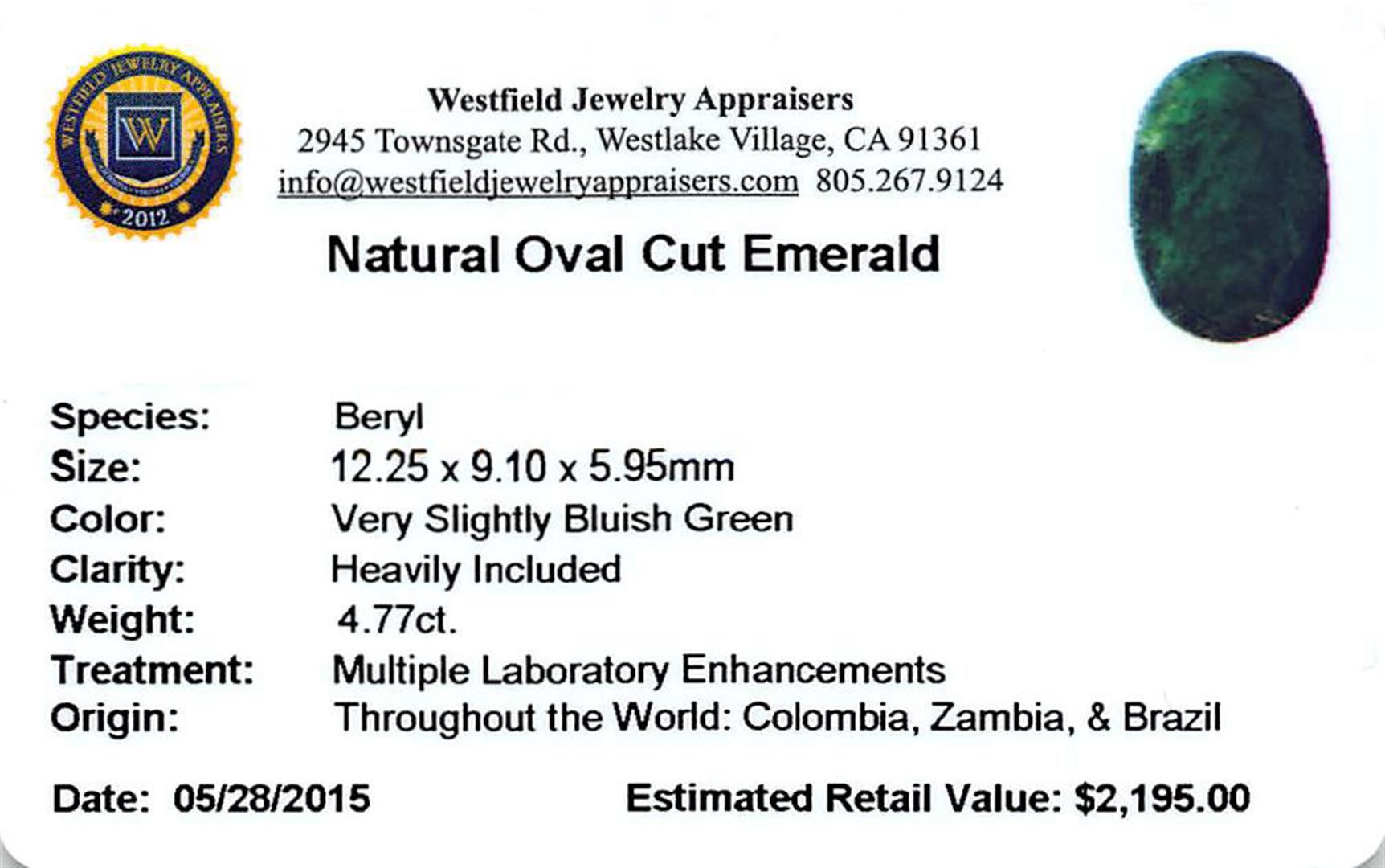 One oval mixed cut natural emerald, measuring 12.25 x 9.10 x 5.95mm, exact weight 4.77ct., clarity is heavily included, type III, dark, very slightly grayish, very slightly bluish green color, (GIA vslbG 7/3), cut is good. Transmitting light somewhat diffusely, translucent, Naturally occurring internal & external characteristics are present, Indications of multiple laboratory enhancements, including high temperature heat treatment. Westfield Appraised.