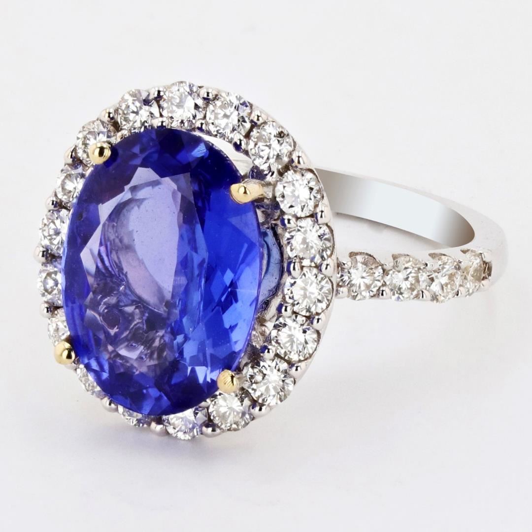 One electronically tested 18KT white gold ladies cast tanzanite & diamond ring. Condition is new, good workmanship. The featured tanzanite is set within a diamond bezel, supported by a diamond set under gallery and diamond set shoulders, completed by a two millimeter wide band. Trademark is Orianne. Identified with markings of "18K". Containing: One prong set oval mixed cut natural tanzanite, measuring 13.30 x 10.00 x 4.58mm, 11% bulge factor, approximate weight of 4.77ct., clarity is eye clean, type I, medium dark, moderately strong, blue color, (GIA B 6/4), cut is good. Transmitting light with no distortion, transparent. Graded in the setting. Tanzanite is a very rare gemstone that is only found in the country of Tanzania. Tanzanite was originally discovered in 1967. Tiffany & Company, named the stone "Tanzanite" after the country of origin. Tanzanite is found in the Usumburu Mountains that border the Umba Valley of northern Tanzania. This region is inhabited by the Masai tribes-people. The mining area is located just south of the Kenya border near Mt. Kilimanjaro. Tanzanite occurs in colors of gray, brown, violet, blue, reddish-purple, & green. The gem is interesting because of its exceptional pleochroism. Rotated in different directions a tanzanite will exhibit multiple changes of color. Tanzanite has a low tolerance to ultrasonic cleaning, and should not be cleaned using this method. Thirty-eight prong set round brilliant cut diamonds, measuring 2.40 - 2.10 x 1.37mm (depth est.), 2.00% GTCF approximate total weight of 38 Stones = 1.71ctw. Graded in the setting. Clarity SI1 to SI2 Color G - I Total Weight of Colored Stones 4.77ct. Total Weight of Diamonds 1.71ctw. Total Weight of Ring 6.06 gm #LREF-8882