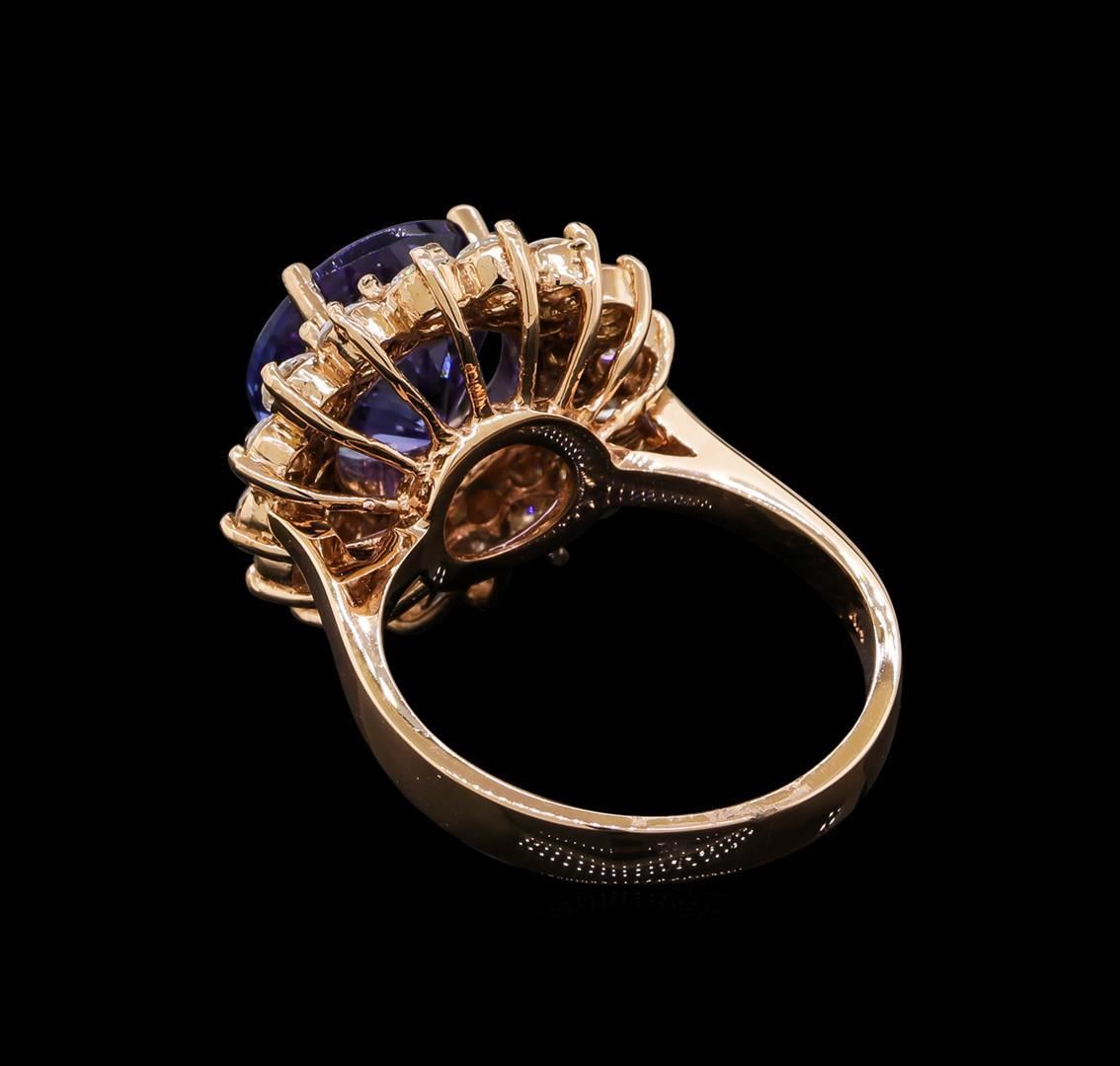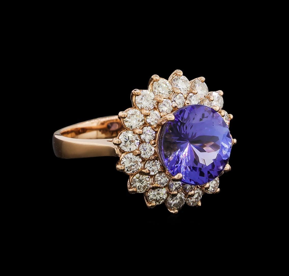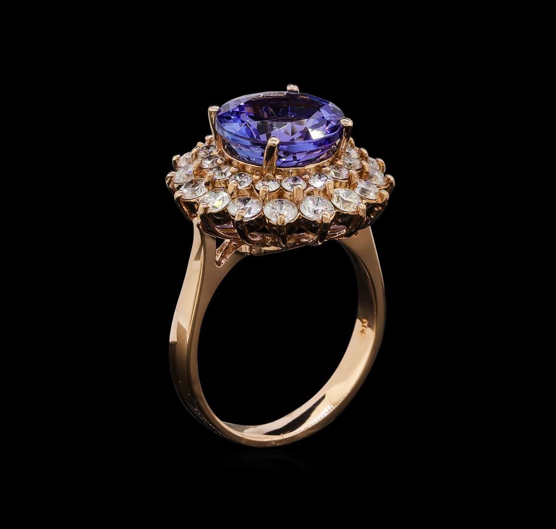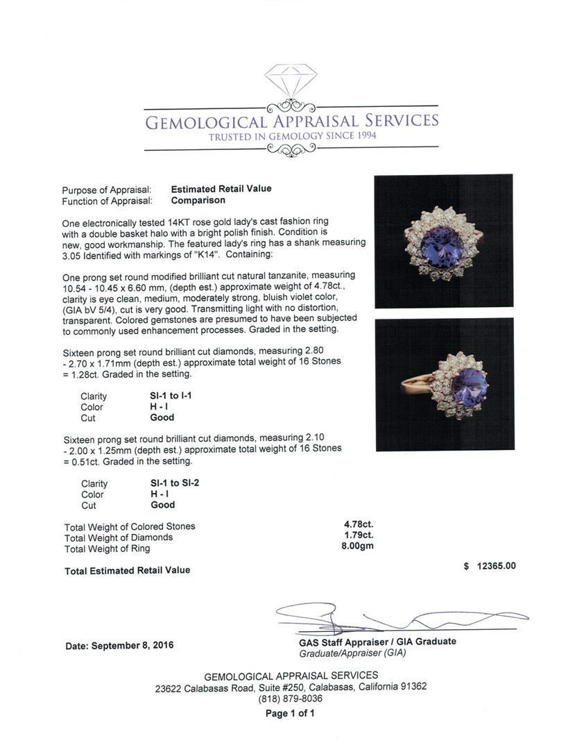 One electronically tested 14KT rose gold lady's cast fashion ring with a double basket halo with a bright polish finish. The featured lady's ring has a shank measuring 3.05 Identified with markings of 'K14'. Condition is new, good workmanship. Containing: One prong set round modified brilliant cut natural tanzanite, measuring 10.54 - 10.45 x 6.60 mm, (depth est.) approximate weight of 4.78ct., clarity is eye clean, medium, moderately strong, bluish violet color, (GIA bV 5/4), cut is very good. Transmitting light with no distortion, transparent. Colored gemstones are presumed to have been subjected to commonly used enhancement processes. Graded in the setting. Sixteen prong set round brilliant cut diamonds, measuring 2.80 - 2.70 x 1.71mm (depth est.) approximate total weight of 16 Stones = 1.28ct. Graded in the setting. Clarity SI-1 to I-1. Color: H - I Cut Good Sixteen prong set round brilliant cut diamonds, measuring 2.10 - 2.00 x 1.25mm (depth est.) approximate total weight of 16 Stones = 0.51ct. Graded in the setting. Clarity SI-1 to SI-2. Color: H - I Cut Good. Total Weight of Colored Stones 4.78ct.. Total Weight of Diamonds 1.79ct.. Total Weight of Ring 8.00gm GAS Appraised.