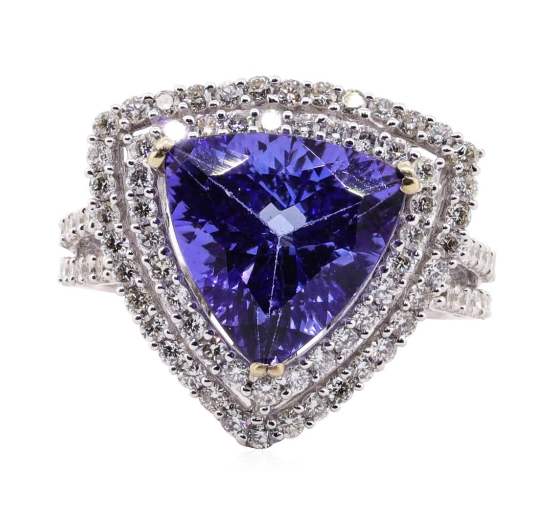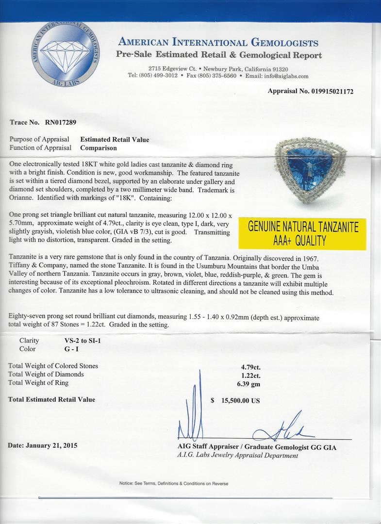 One 4.79ct Tanzanite and Diamond Ring - 18KT White Gold. AIG certified. See Appraisal for more details. AIG Appraised.
