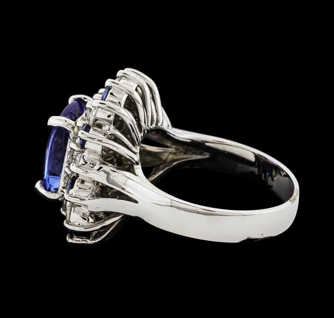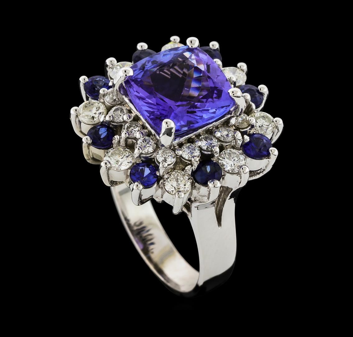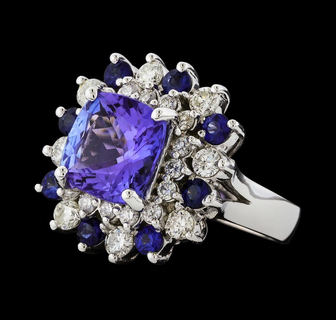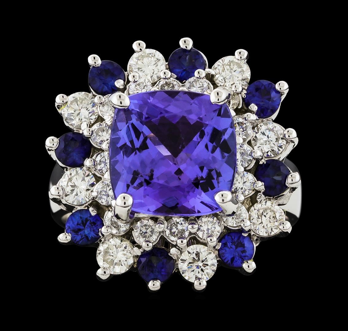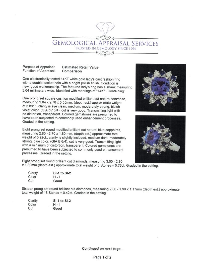 One electronically tested 14KT white gold lady's cast fashion ring with a double basket halo with a bright polish finish. The featured lady's ring has a shank measuring 3.64 millimeters wide. Identified with markings of '14K'. Condition is new, good workmanship. Containing: One prong set square cushion modified brilliant cut natural tanzanite, measuring 9.84 x 9.78 x 5.55mm, (depth est.) approximate weight of 3.89ct., clarity is eye clean, medium, moderately strong, bluish violet color, (GIA bV 5/4), cut is very good. Transmitting light with no distortion, transparent. Colored gemstones are presumed to have been subjected to commonly used enhancement processes. Graded in the setting. Eight prong set round modified brilliant cut natural blue sapphires, measuring 2.80 - 2.70 x 1.80 mm, (depth est.) approximate total weight of 0.92ct., clarity is slightly included, medium dark, moderately strong, blue color, (GIA B 6/4), cut is very good. Transmitting light with a minimum of distortion, transparent. Colored gemstones are presumed to have been subjected to commonly used enhancement processes. Graded in the setting. Eight prong set round brilliant cut diamonds, measuring 3.00 - 2.90 x 1.80mm (depth est.) approximate total weight of 8 Stones = 0.76ct. Graded in the setting. Clarity SI-1 to SI-2. Color: H - I Cut Good Sixteen prong set round brilliant cut diamonds, measuring 2.00 - 1.90 x 1.17mm (depth est.) approximate total weight of 16 Stones = 0.42ct. Graded in the setting. Clarity SI-1 to SI-2. Color: H - I Cut Good. Total Weight of Colored Stones 4.81ct.. Total Weight of Diamonds 1.18ct.. Total Weight of Ring 9.90gm. GAS Appraised at $10,040.00.