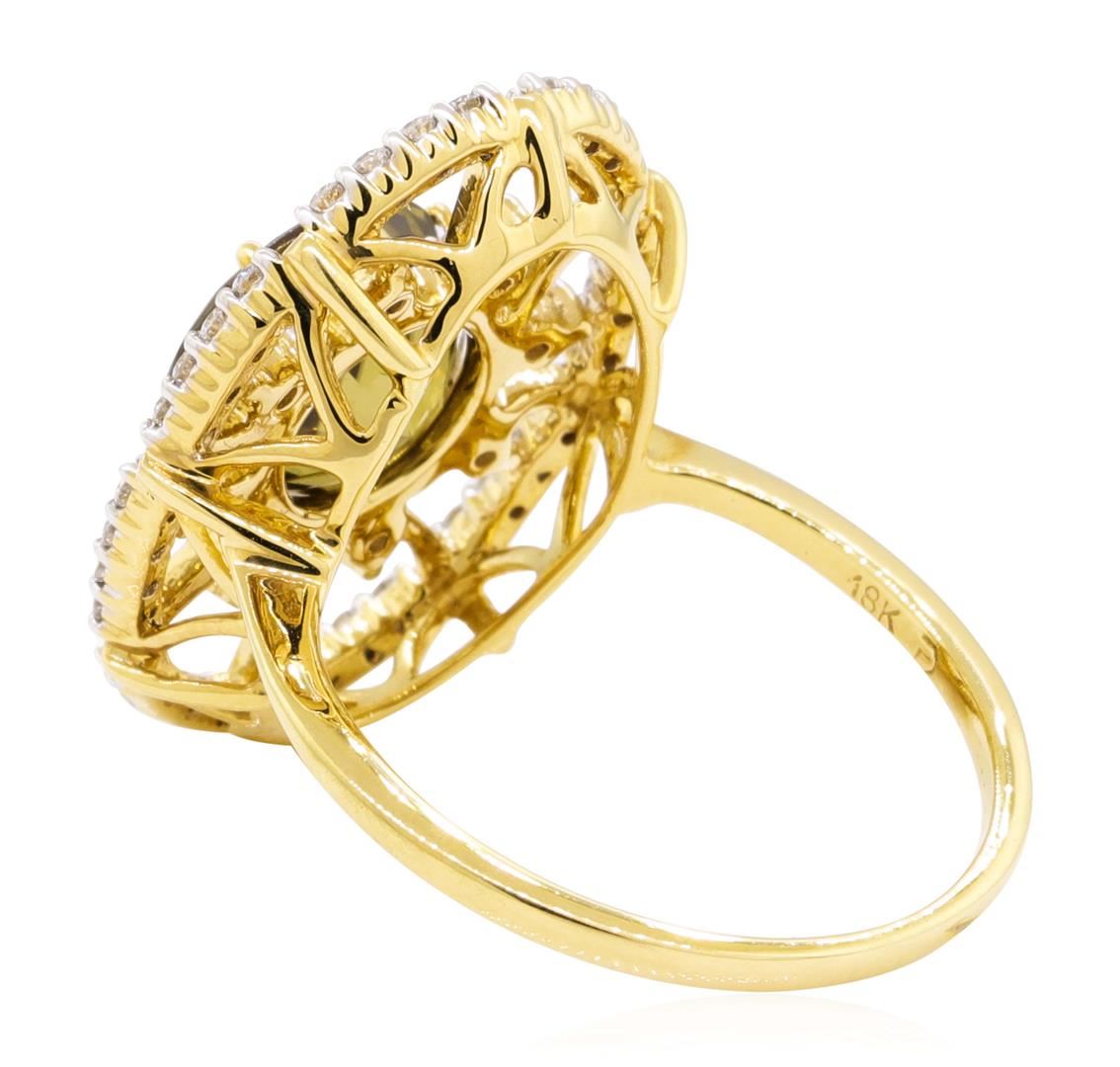 One electronically tested 18KT yellow gold lady's cast fashion ring with a starburst oval halo with a bright polish finish. The featured lady's ring has a shank measuring 1.35 millimeters wide. Identified with markings of '18K'. Condition is new, good workmanship. Containing: One prong set round modified mixed cut natural yellow zircon, measuring 8.87 - 8.75 x 5.42 mm, (depth est.) 5%. bulge factor, approximate weight of 4.33ct., clarity is eye clean, medium dark, brownish, orangy yellow color, (GIA oY 6/1), cut is good. Transmitting light with no distortion, transparent. Colored gemstones are presumed to have been subjected to commonly used enhancement processes. Graded in the setting. Eight prong set round brilliant cut diamonds, measuring 2.10 - 2.00 x 1.27mm (depth est.) approximate total weight of 8 Stones = 0.26ct. Graded in the setting. Color G - H Clarity VS-2 to SI-1 Cut Very Good Thirty-Two prong set round brilliant cut diamonds, measuring 1.35 - 1.30 x 0.80mm (depth est.) approximate total weight of 32 Stones = 0.26ct. Graded in the setting. Color G - H Clarity VS-2 to SI-1 Cut Very Good. Total Weight of Colored Stones 4.33ct.. Total Weight of Diamonds 0.52ct.. Total Weight of Ring 5.60gm GAS Appraised at $4255.00. GAS Appraised.