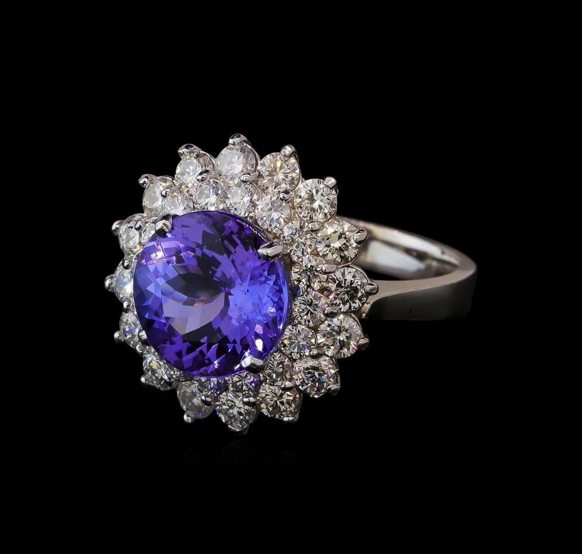 One electronically tested 14KT white gold lady's cast fashion ring with a double basket halo with a bright polish finish. The featured lady's ring has a shank measuring 2.98 millimeters wide. Identified with markings of 'K14'. Condition is new, good workmanship. Containing: One prong set round modified brilliant cut natural tanzanite, measuring 10.41 - 10.36 x 6.65 mm, (depth est.) approximate weight of 4.85ct., clarity is eye clean, medium, moderately strong, bluish violet color, (GIA bV 5/4), cut is very good. Transmitting light with no distortion, transparent. Colored gemstones are presumed to have been subjected to commonly used enhancement processes. Graded in the setting. Sixteen prong set round brilliant cut diamonds, measuring 2.80 - 2.70 x 1.68mm (depth est.) approximate total weight of 16 Stones = 1.25ct. Graded in the setting. Clarity SI-1 to I-1. Color: H - I Cut Good Sixteen prong set round brilliant cut diamonds, measuring 2.30 - 2.20 x 1.35mm (depth est.) approximate total weight of 16 Stones = 0.67ct. Graded in the setting. Clarity SI-1 to I-1. Color: H - I Cut Good. Total Weight of Colored Stones 4.85ct. Total Weight of Diamonds 1.92ct. Total Weight of Ring 7.70gm. GAS Appraised.