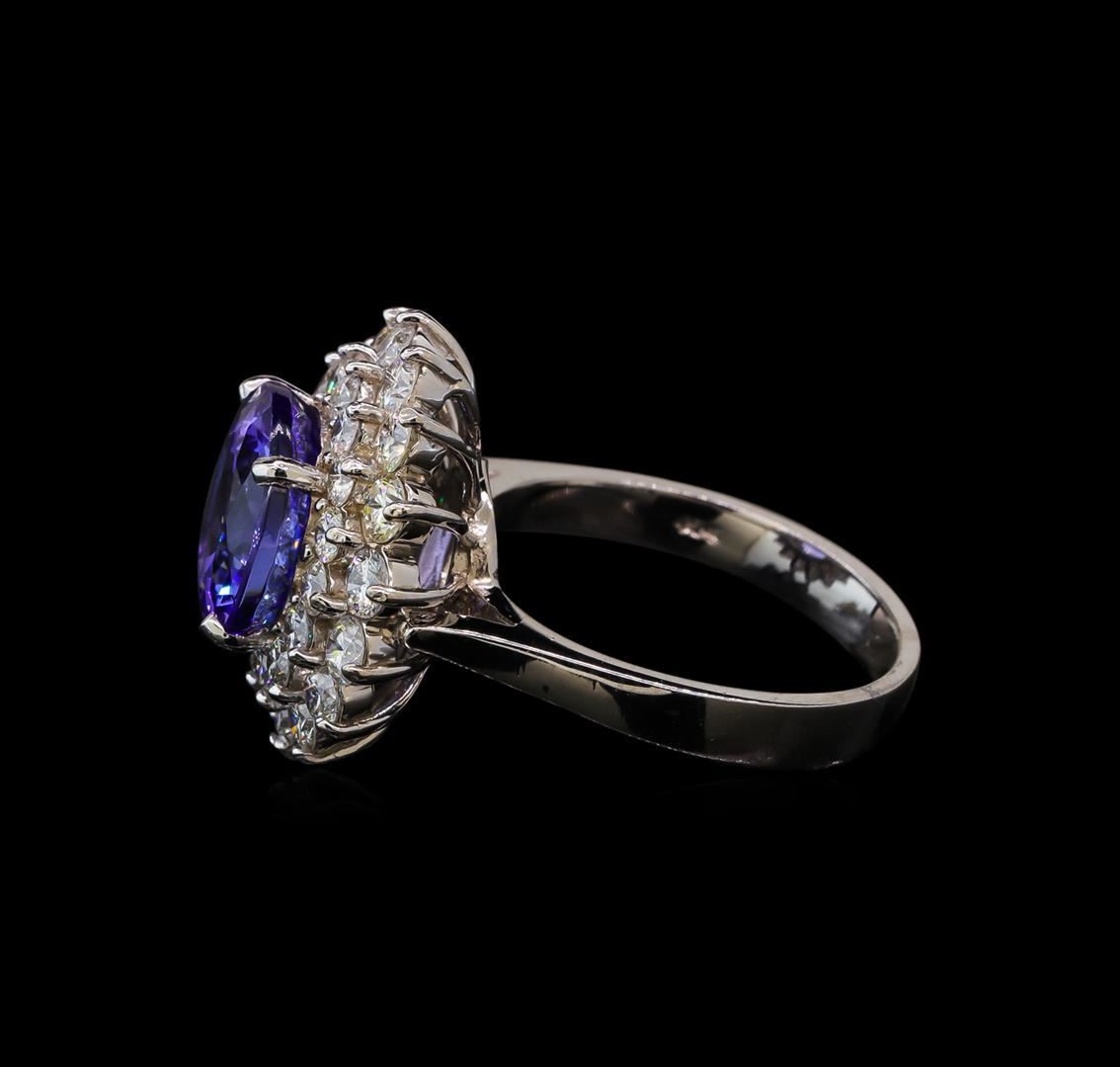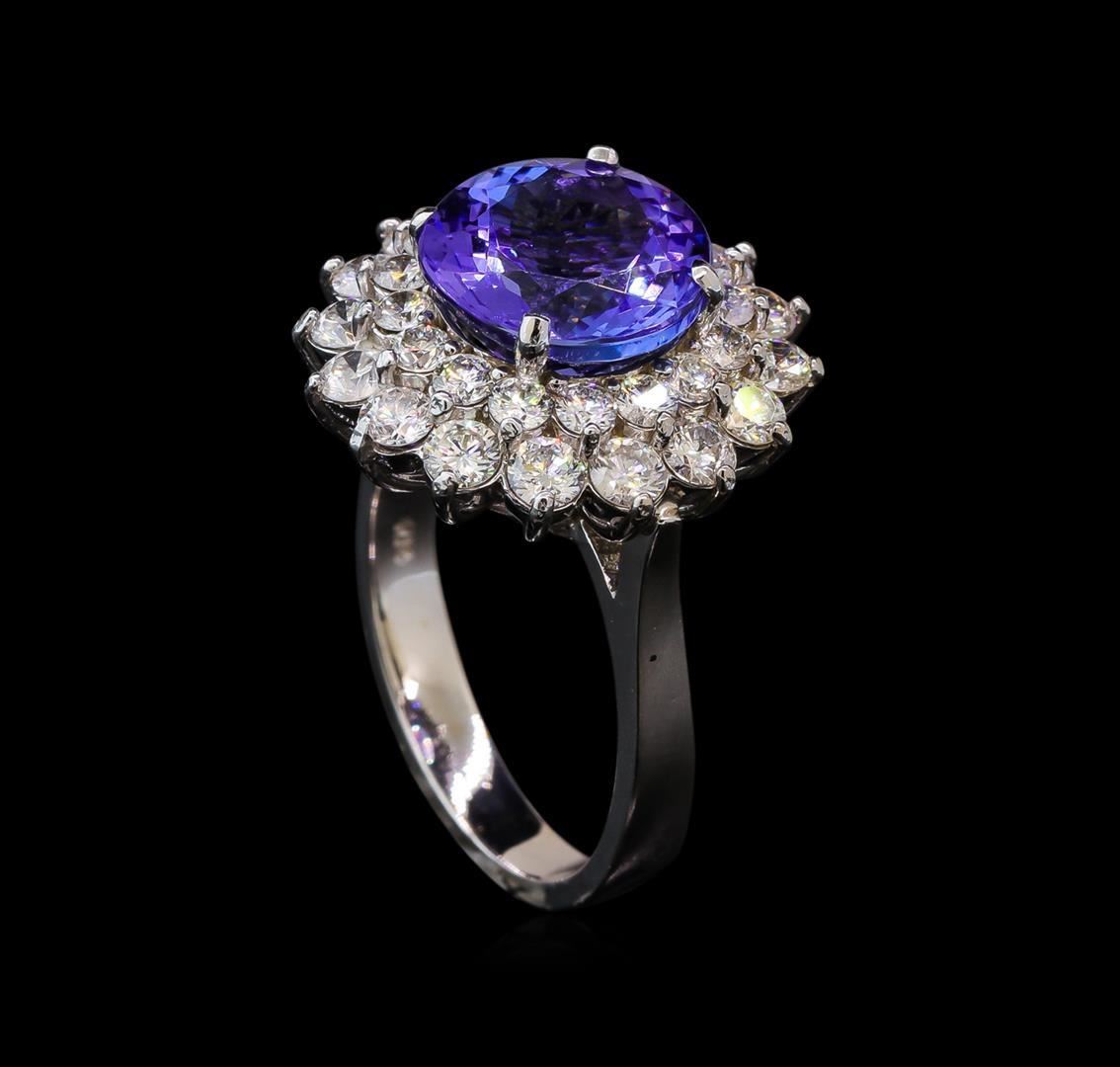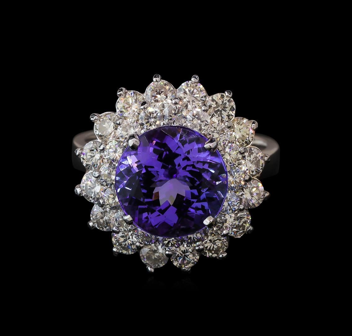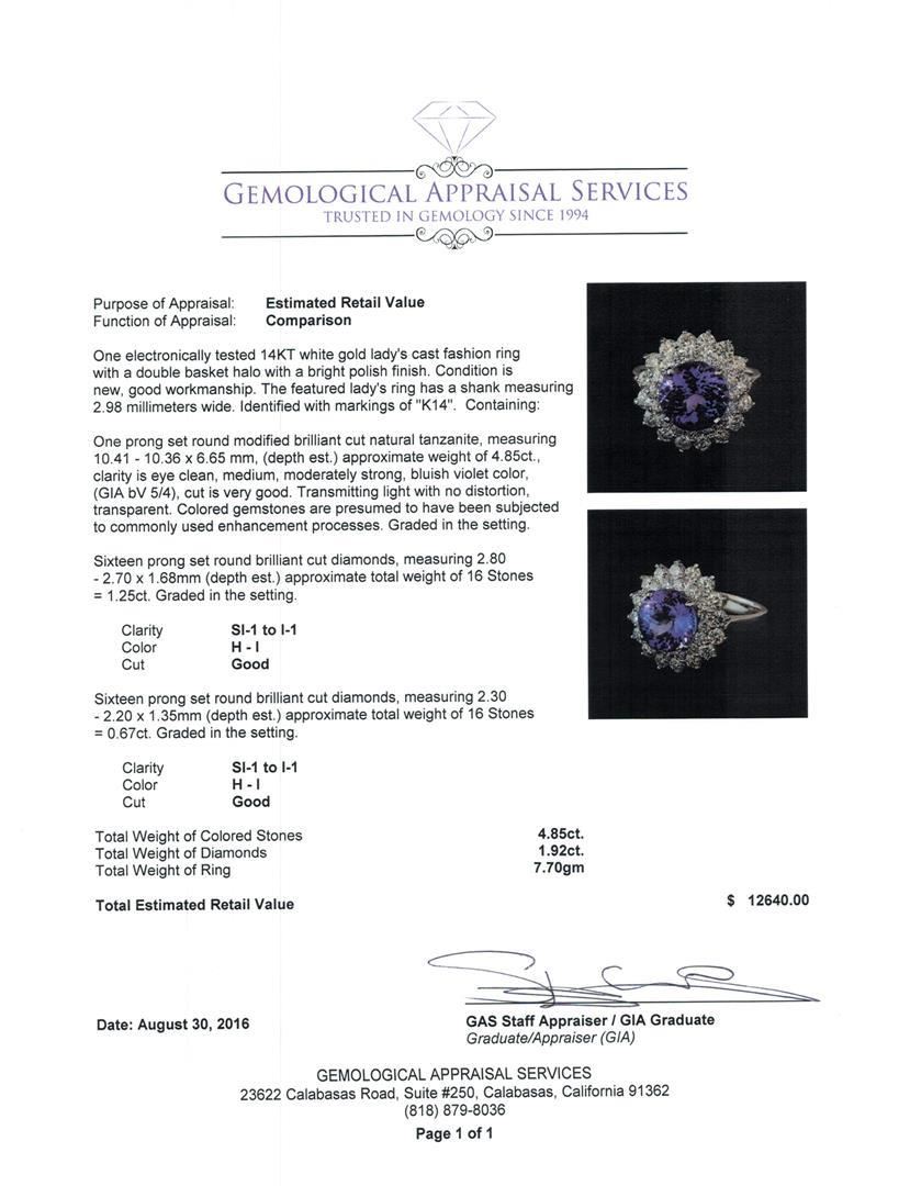 One electronically tested 14KT white gold lady's cast fashion ring with a double basket halo with a bright polish finish. The featured lady's ring has a shank measuring 2.98 millimeters wide. Identified with markings of 'K14'. Condition is new, good workmanship. Containing: One prong set round modified brilliant cut natural tanzanite, measuring 10.41 - 10.36 x 6.65 mm, (depth est.) approximate weight of 4.85ct., clarity is eye clean, medium, moderately strong, bluish violet color, (GIA bV 5/4), cut is very good. Transmitting light with no distortion, transparent. Colored gemstones are presumed to have been subjected to commonly used enhancement processes. Graded in the setting. Sixteen prong set round brilliant cut diamonds, measuring 2.80 - 2.70 x 1.68mm (depth est.) approximate total weight of 16 Stones = 1.25ct. Graded in the setting. Clarity SI-1 to I-1. Color: H - I Cut Good Sixteen prong set round brilliant cut diamonds, measuring 2.30 - 2.20 x 1.35mm (depth est.) approximate total weight of 16 Stones = 0.67ct. Graded in the setting. Clarity SI-1 to I-1. Color: H - I Cut Good. Total Weight of Colored Stones 4.85ct. Total Weight of Diamonds 1.92ct. Total Weight of Ring 7.70gm. GAS Appraised.