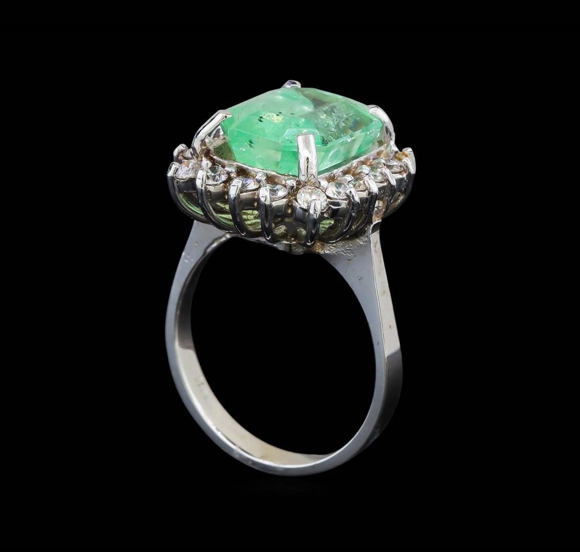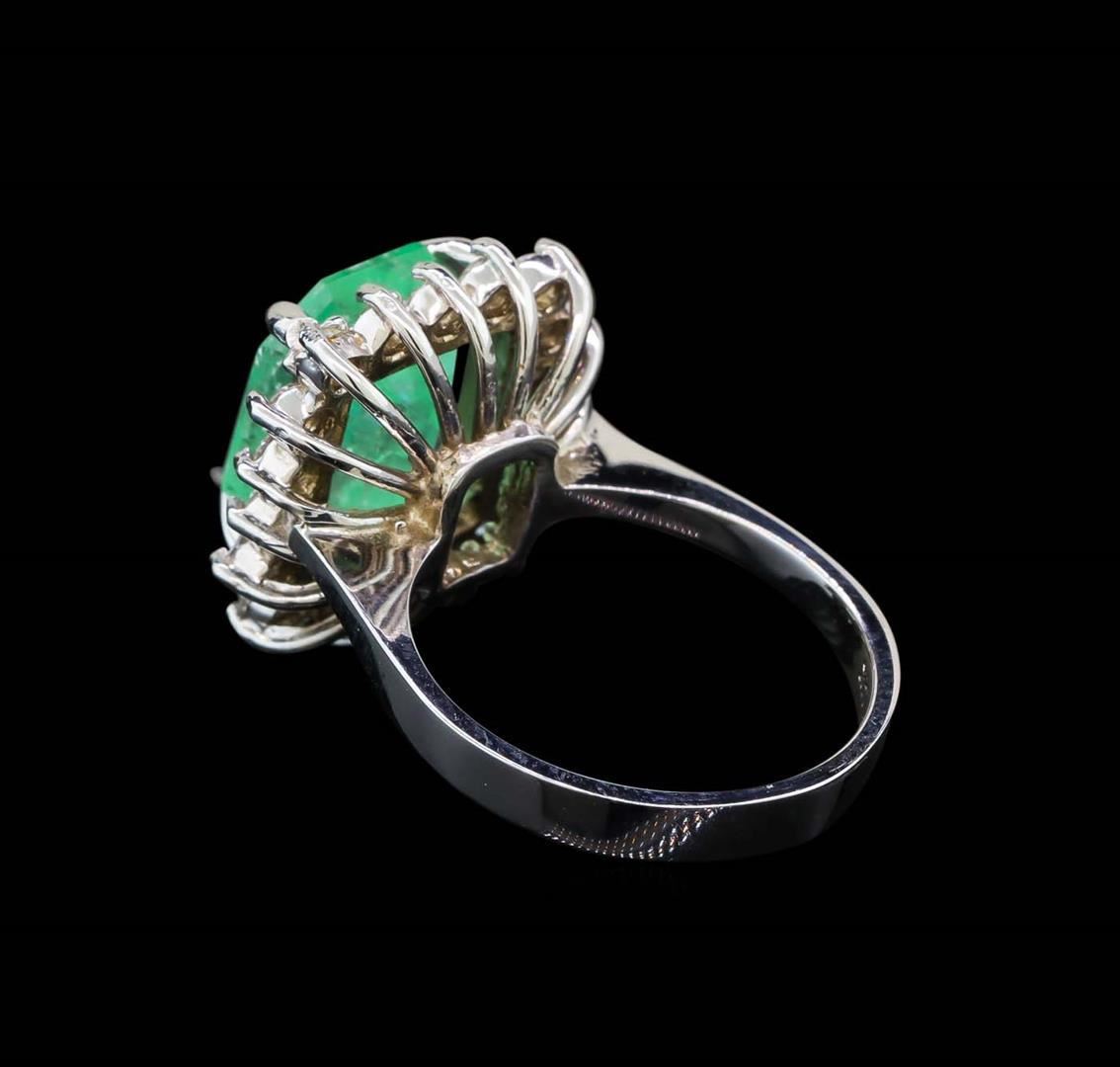 One electronically tested 14KT white gold lady's cast fashion ring with a basket halo with a bright polish finish. The featured lady's ring has a shank measuring 2.77 millimeters wide. Identified with markings of '14K'. Condition is new, good workmanship. Containing: One prong set emerald step cut natural emerald, measuring 11.55 x 9.01 x 6.56mm, (depth est.) approximate weight of 4.88ct., clarity is moderately included, medium light, moderately strong, green color, (GIA G 4/4), cut is good. Transmitting light somewhat diffusely, transparent to translucent. Naturally occurring internal & external characteristics are present. Indications of oil residue. Colored gemstones are presumed to have been subjected to commonly used enhancement processes. Graded in the setting. Eighteen prong set round brilliant cut diamonds, measuring 2.10 - 2.00 x 1.27mm (depth est.) approximate total weight of 18 Stones = 0.60ct. Graded in the setting. Clarity SI-1 to SI-2. Color: H - I Cut Good. Total Weight of Colored Stones 4.88ct.. Total Weight of Diamonds 0.60ct.. Total Weight of Ring 6.40gm. GAS Appraised.