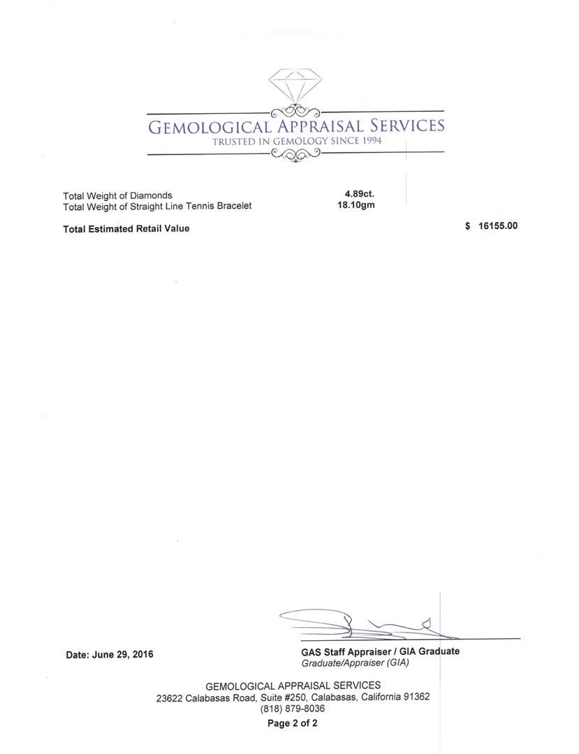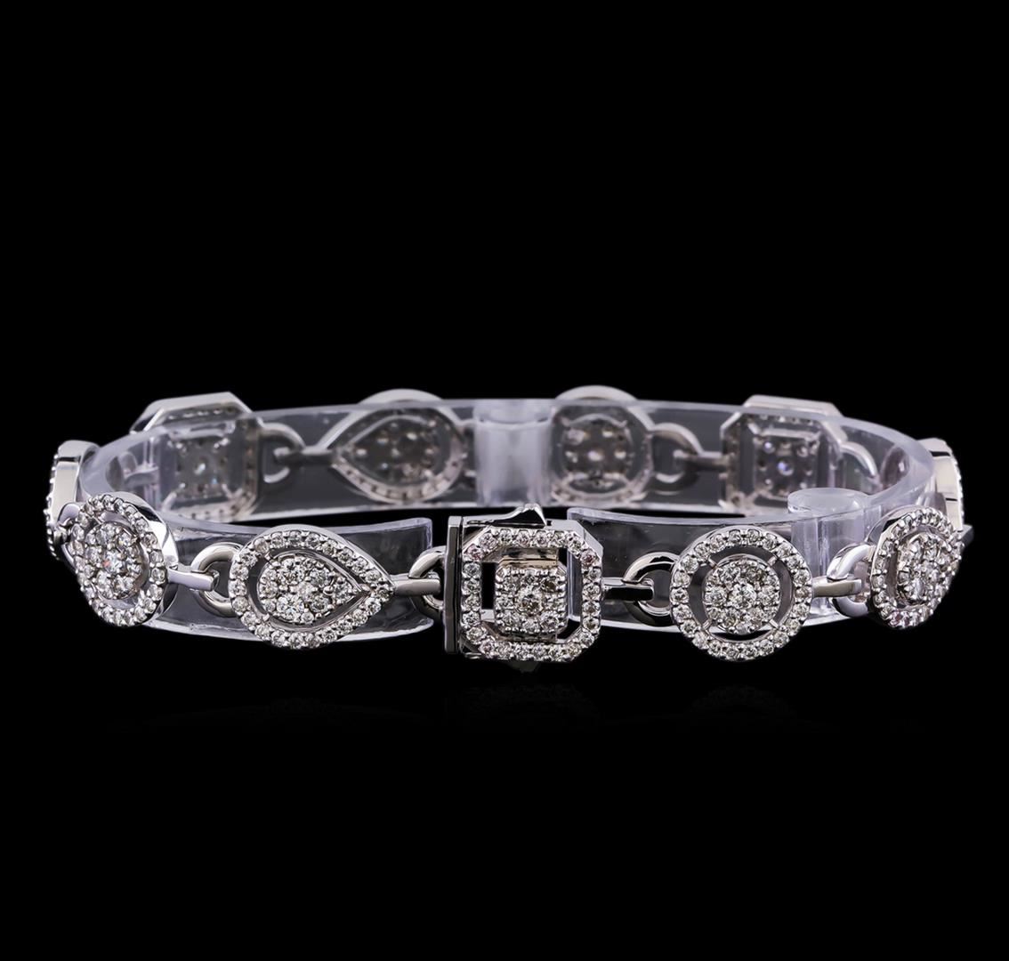 One electronically tested 14KT white gold lady's combination cast & assembled fashion straight line tennis bracelet with a tongue clasp with a bright polish finish. The featured lady's bracelet measure 7.25 inches in length. Identified with markings of "K14". Condition is new, good workmanship. Containing: Fifteen prong set round brilliant cut diamonds, measuring 2.40 - 2.35 x 1.48mm (depth est.) approximate total weight of 15 Stones = 0.76ct. Graded in the setting. Clarity: SI-1 to SI-2. Color: H - I. Cut Good Fifty-Six prong set round brilliant cut diamonds, measuring 1.70 - 1.60 x 1.02mm (depth est.) approximate total weight of 56 Stones = 0.95ct. Graded in the setting. Clarity: SI-1 to SI-2. Color: H - I. Cut Good Two Hundred Forty-Eight prong set round brilliant cut diamonds, measuring 1.40 - 1.30 x 0.84mm (depth est.) approximate total weight of 248 Stones = 2.50ct. Graded in the setting. Clarity: SI-1 to SI-2. Color: G - I. Cut Good Fifty-Two prong set round brilliant cut diamonds, measuring 1.50 - 1.45 x 0.92mm (depth est.) approximate total weight of 52 Stones = 0.68ct. Graded in the setting. Clarity: SI-1 to SI-2. Color: H - I. Cut Good. Total Weight of Diamonds 4.89ct. Total Weight of Straight Line Tennis Bracelet 18.10gm. GAS Appraised.