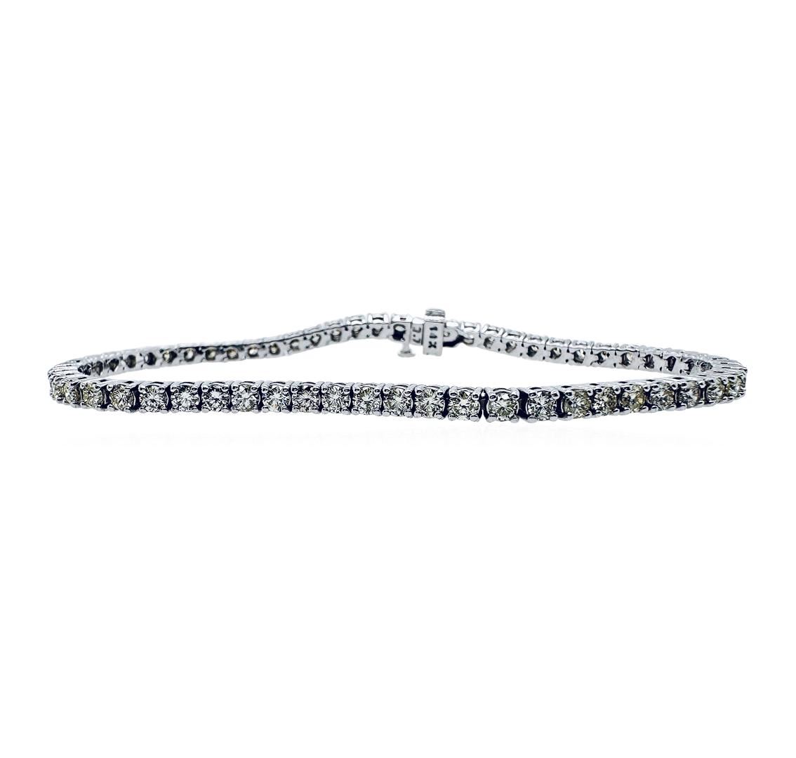 One electronically tested 14KT white gold lady's combination cast & assembled fashion straight line tennis bracelet with a tongue clasp with fold-under safety with a basket motif with a bright polish finish. Condition is new, good workmanship. The featured lady's bracelet measures approximately 7.00 inches in length. Identified with markings of 14K. Containing: 59 prong set round brilliant cut diamonds, measuring 2.80 - 2.70 x 1.71 mm (depth est), 5% GTCF approximate total weight of 59 stones = 4.89 ctw. Graded in the setting. Total weight of Diamonds: 4.89 ctw. Total weight of Tennis Bracelet 11.10gm. Total estimated retail value: $135200
