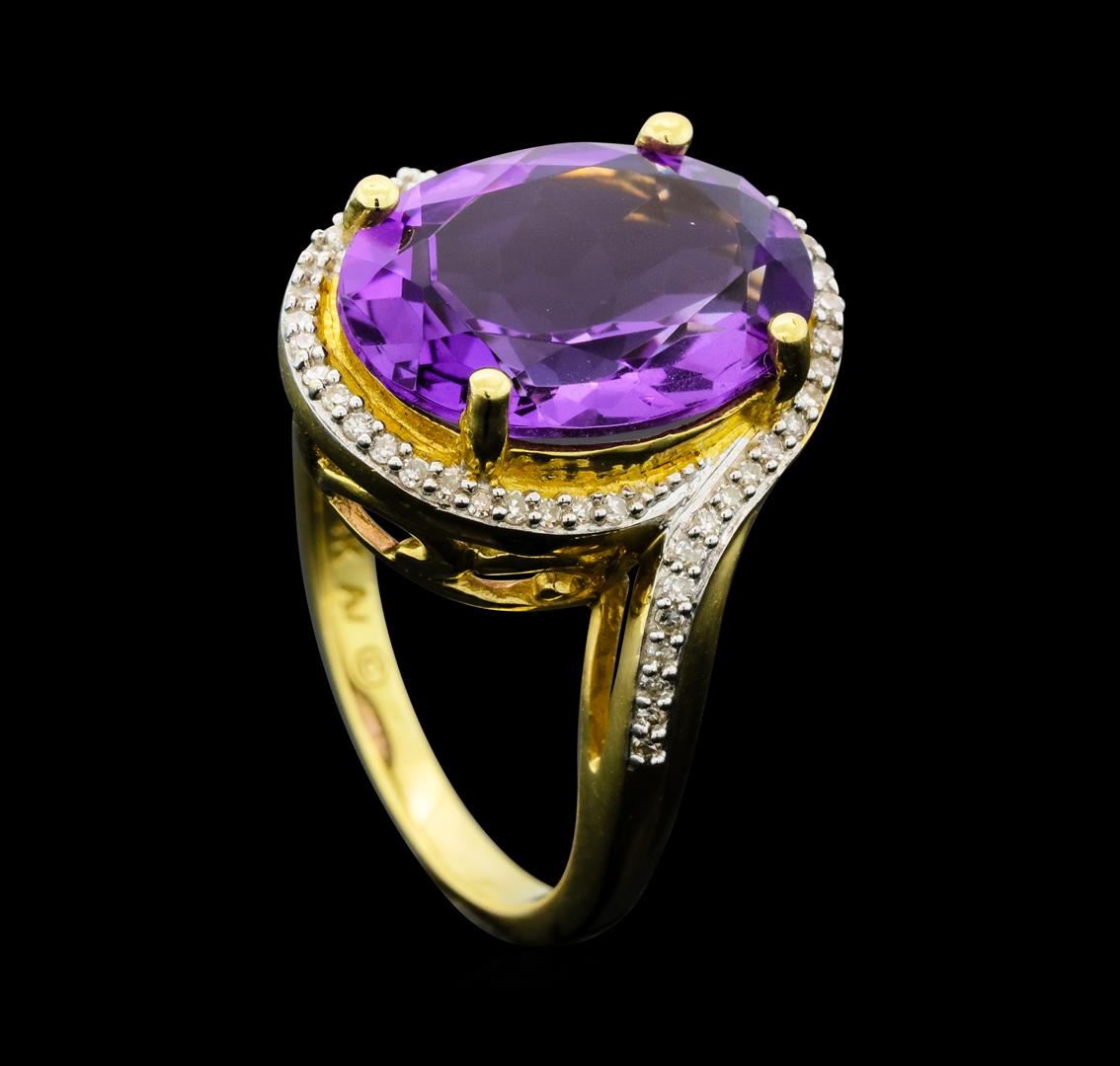 One electronically tested 14KT yellow gold lady's cast fashion ring with a bypass halo with a bright polish finish. The featured lady's ring has a shank measuring 2.10 millimeters wide. Identified with markings of '14K'. Condition is new, good workmanship. Containing: One prong set oval modified brilliant cut natural amethyst, measuring 14.00 x 9.95 x 6.00mm, (depth est.) 5%. bulge factor, approximate weight of 4.90ct., clarity is eye clean, medium light, moderately strong, purple color, (GIA P 4/4), cut is good. Transmitting light with no distortion, transparent. Colored gemstones are presumed to have been subjected to commonly used enhancement processes. Graded in the setting. Fifty-Four prong set single cut diamonds, measuring 1.00 - 0.95 x 0.59mm (depth est.) approximate total weight of 54 Stones = 0.18ct. Clarity SI-1 to SI-2. Color: H - I Cut Good. Total Weight of Colored Stones 4.90ct.. Total Weight of Diamonds 0.18ct.. Total Weight of Ring 7.10gm. GAS Appraised.