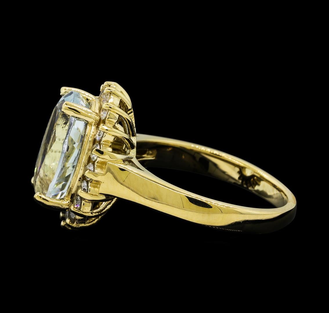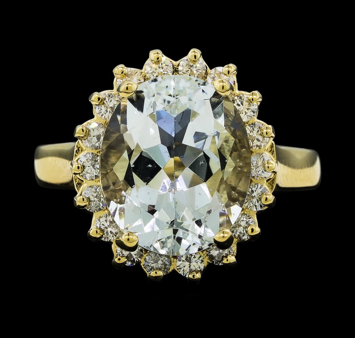 One Aquamarine and Diamond Ring including: 14KT Yellow Gold weighing a total of 5.21 grams, Aquamarine weighing a total of 4.91ct, and 18 Diamonds weighing a total of 0.44ctw.