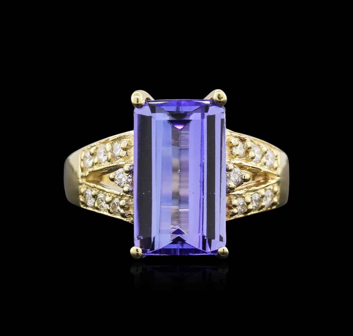 One ring featuring: 14KT yellow gold weighing 5.11 grams containing one tanzanite center stone with a total weight of 4.95ct and 14 diamonds with a total weight of 0.24ct.