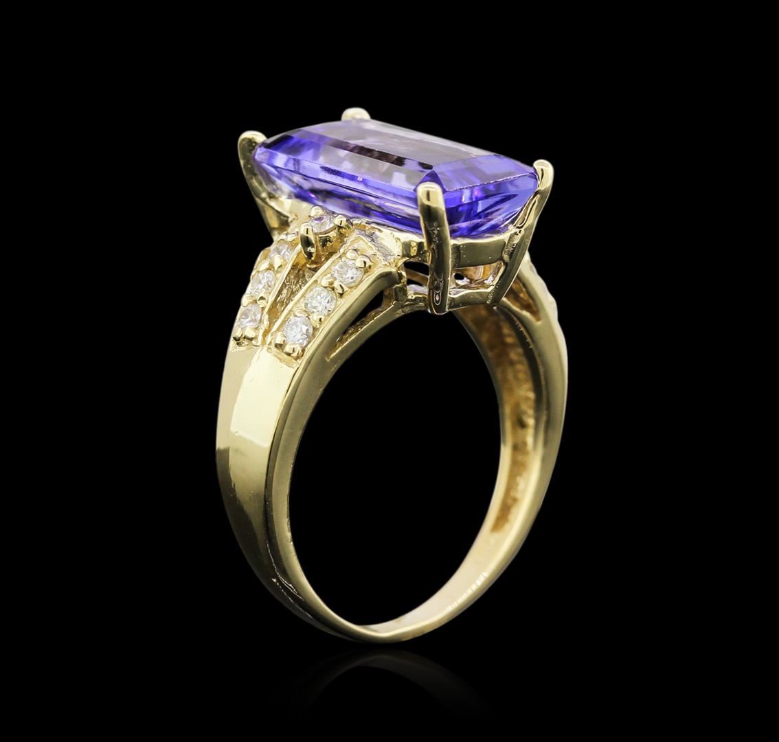 One ring featuring: 14KT yellow gold weighing 5.11 grams containing one tanzanite center stone with a total weight of 4.95ct and 14 diamonds with a total weight of 0.24ct.