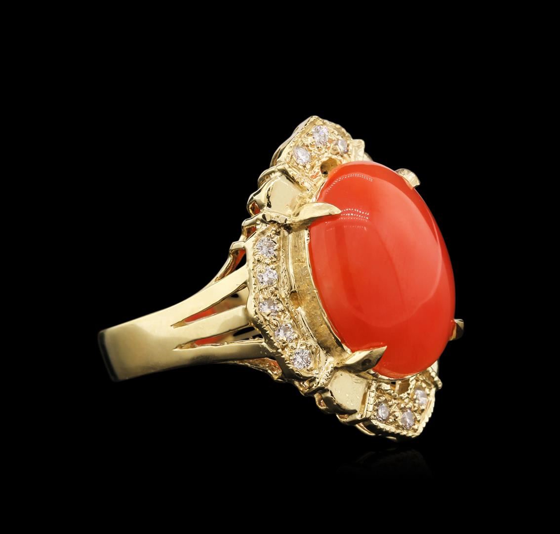 One ring featuring: 14KT yellow gold weighing 6.88 grams containing one coral center stone with a total weight of 4.97ct and 16 diamonds with a total weight of 0.22ct.