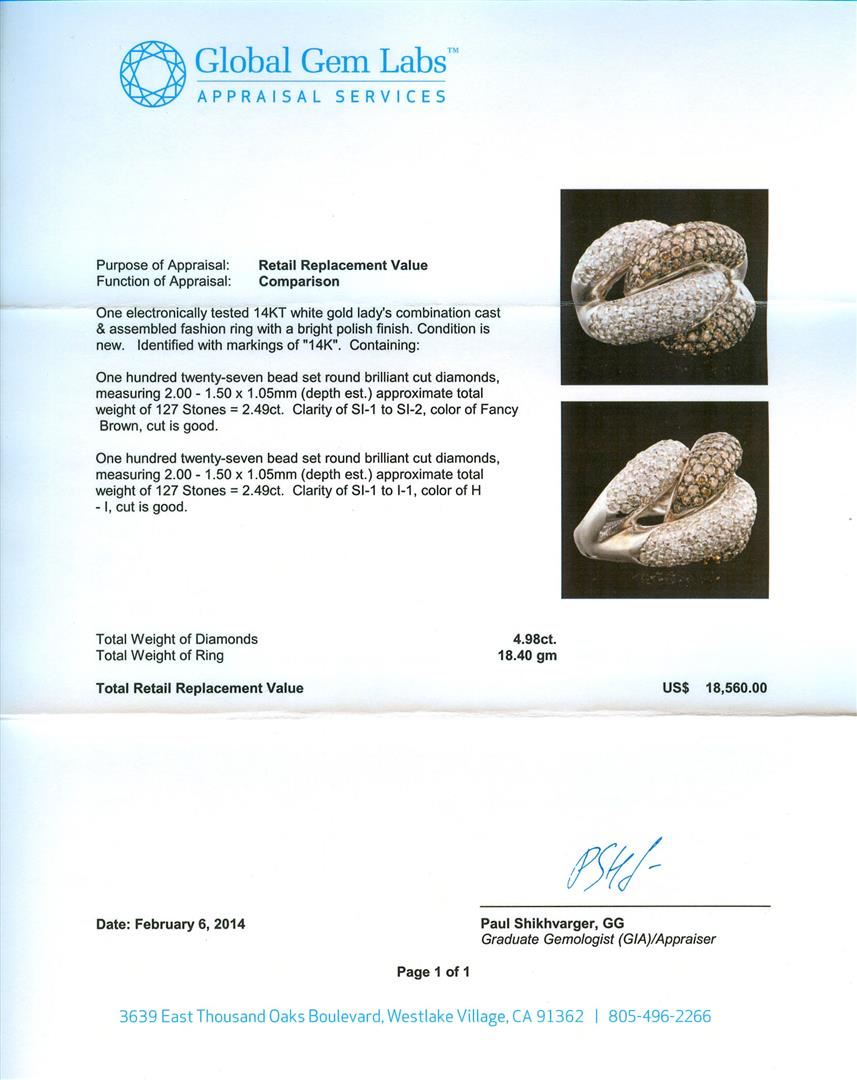 One 14KT white gold ring weighing 18.40 grams containing fancy brown diamonds with SI1-SI2 clarity weighing 2.49ctw and white diamonds with SI1-I1 clarity and H-I color weighing 2.49ctw. GGL Appraised.