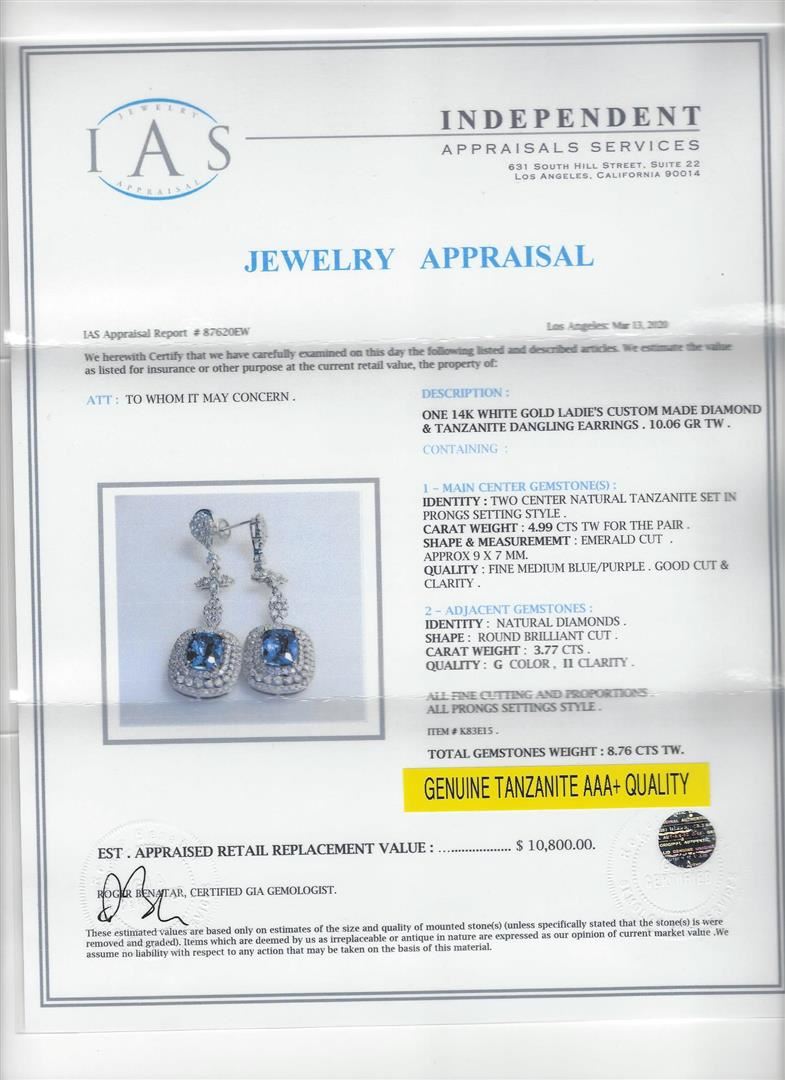 One 4.99ctw Tanzanite and Diamond Earrings - 14KT White Gold. IAS certified. See Appraisal for more details.