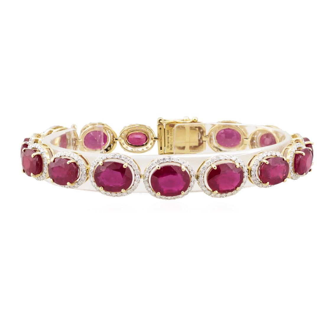 One electronically tested 14KT yellow gold ladies cast & assembled ruby & diamond bracelet. The seven and one quarter inch length bracelet features a flexible graduating ribbon of rubies set within diamond bezels, terminating in a concealed clasp with twin safeties. Bright polish finish with rhodium accents Trademark is Orianne. Identified with markings of "14K". Condition is new, good workmanship. Containing: Fifteen prong set oval mixed cut natural rubies exact total weight 40.27ct., clarity is heavily included, type II, medium dark, moderately strong, slightly purplish red color, (GIA slpR 6/4), cut is good. Transmitting light somewhat diffusely, transparent to translucent. Naturally occurring internal & external characteristics are present. Indications of laboratory high temperature heat treatment, with glass & flux additives. The color grade is an average for the group. Graded in the setting. Ruby has a low tolerance to rhodium plating, repolishing the surface, & ultrasonic cleaning. Three Hundred Four prong set round brilliant cut diamonds exact total weight 304 Stones = 3.07ct. The color grade reflects the overall average for the group. Graded in the setting. Clarity I-1 to I-3 Color G - H Total Weight of Colored Stones 40.27 ct. Total Weight of Diamonds 3.07 ct. Total Weight of Bracelet 22.10 gm Estimated Retail Value $ 14,485.00 US