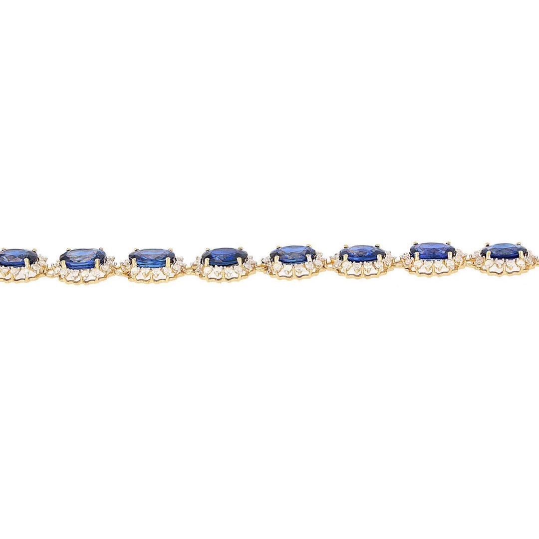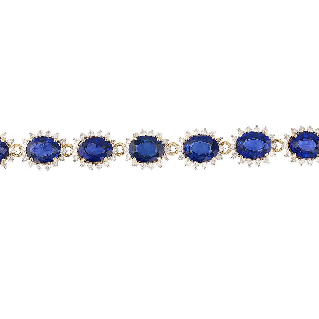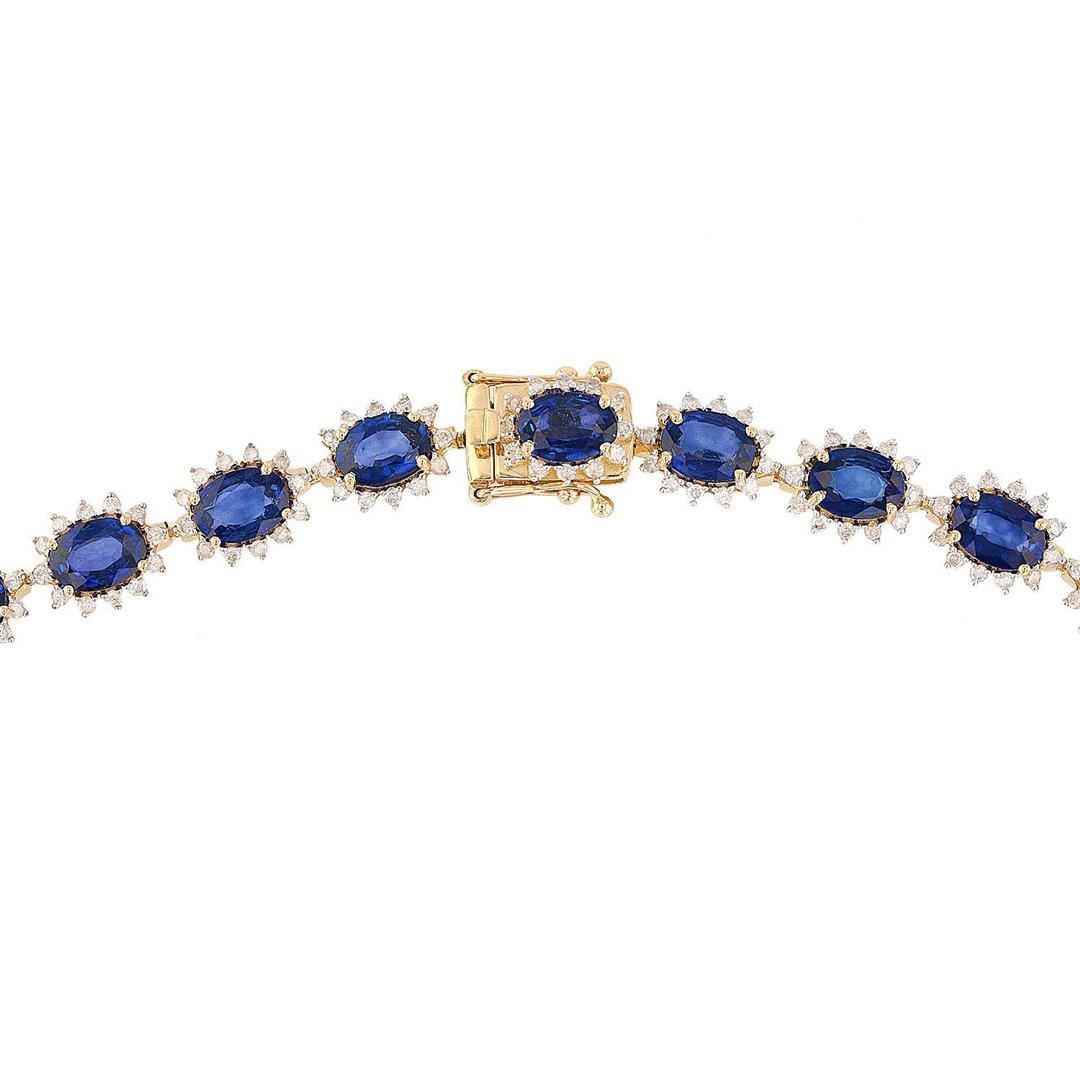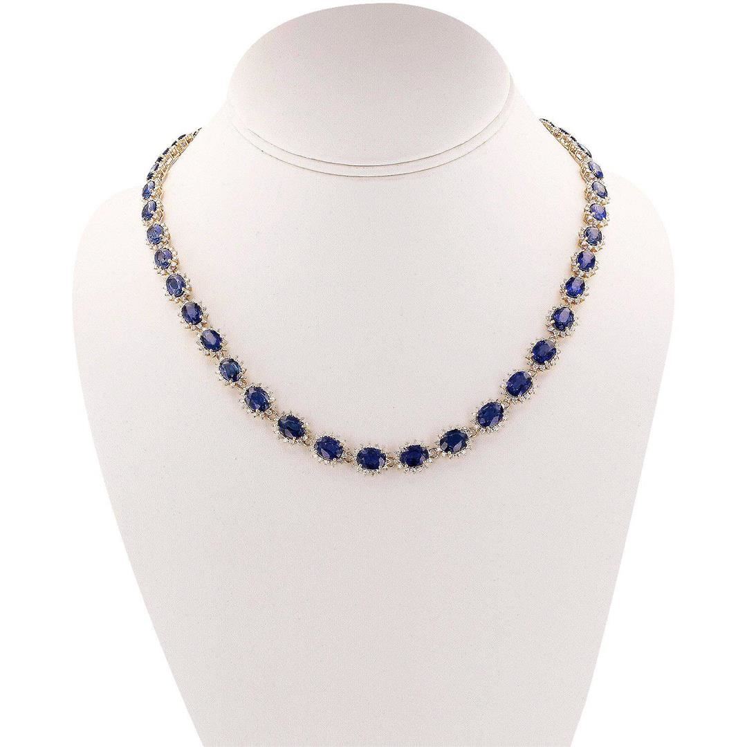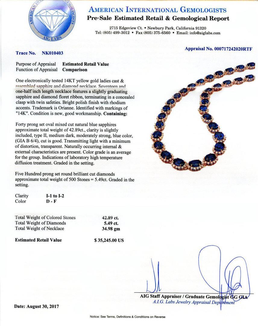 One electronically tested 14KT yellow gold ladies cast & assembled sapphire and diamond necklace. Seventeen and one-half inch length necklace features a slightly graduating sapphire and diamond floret ribbon, terminating in a concealed clasp with twin safeties. Bright polish finish with rhodium accents. Trademark is Orianne. Identified with markings of "14K". Condition is new, good workmanship. Containing: Forty prong set oval mixed cut natural blue sapphires approximate total weight of 42.89ct., clarity is slightly included, type II, medium dark, moderately strong, blue color, (GIA B 6/4), cut is good. Transmitting light with a minimum of distortion, transparent. Naturally occurring internal & external characteristics are present. Color grade is an average for the group. Indications of laboratory high temperature diffusion treatment. Graded in the setting. Five Hundred prong set round brilliant cut diamonds approximate total weight of 500 Stones = 5.49ct. Graded in the setting. Clarity I-1 to I-2 Color D - F Total Weight of Colored Stones 42.89 ct. Total Weight of Diamonds 5.49 ct. Total Weight of Necklace 34.98 gm