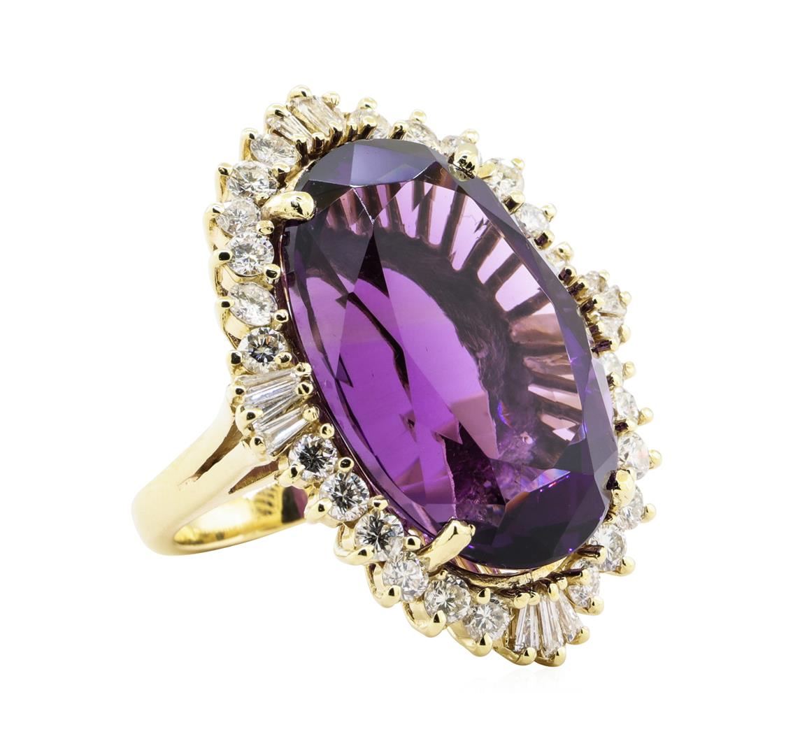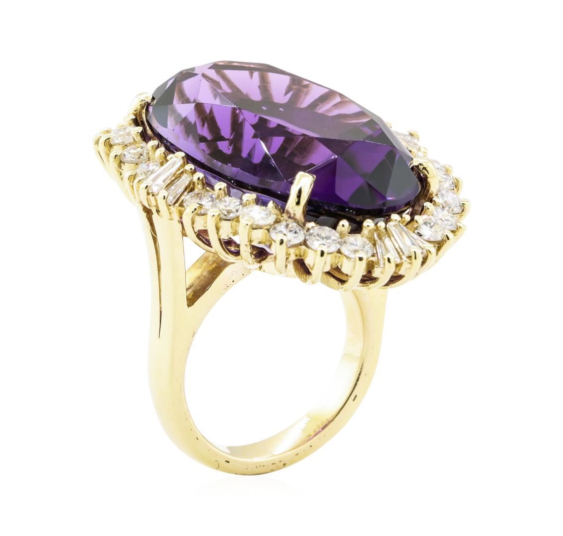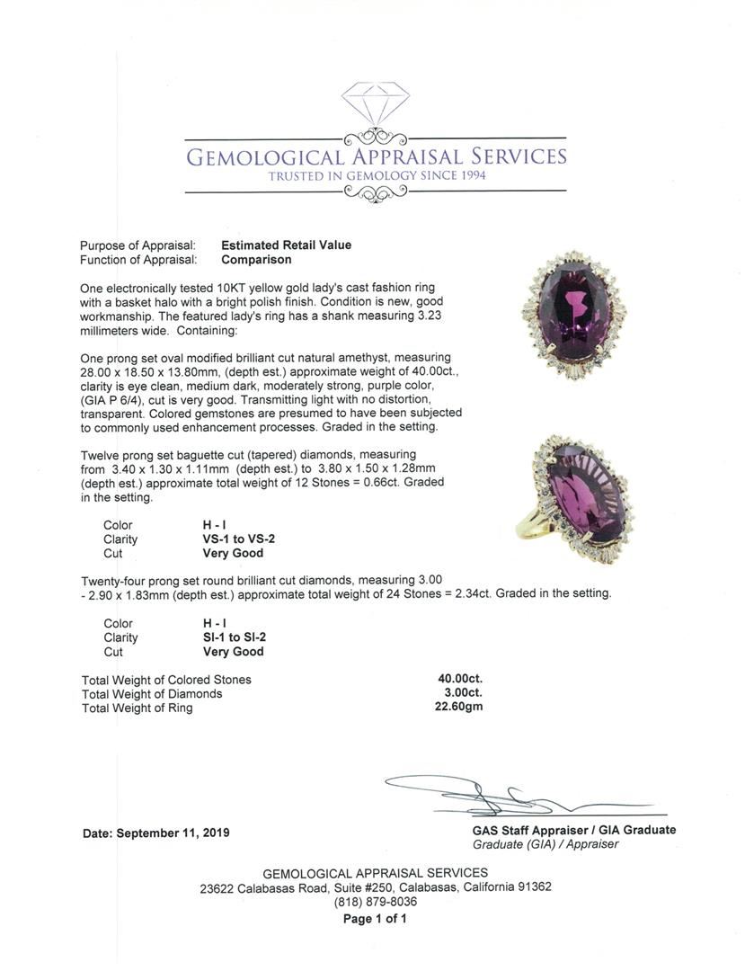 One electronically tested 10KT yellow gold lady's cast fashion ring with a basket halo with a bright polish finish. The featured lady's ring has a shank measuring 3.23 millimeters wide. Condition is new, good workmanship. Containing: One prong set oval modified brilliant cut natural amethyst, measuring 28.00 x 18.50 x 13.80mm, (depth est.) approximate weight of 40.00ct., clarity is eye clean, medium dark, moderately strong, purple color, (GIA P 6/4), cut is very good. Transmitting light with no distortion, transparent. Colored gemstones are presumed to have been subjected to commonly used enhancement processes. Graded in the setting. Twelve prong set baguette cut (tapered) diamonds, measuring from 3.40 x 1.30 x 1.11mm (depth est.) to 3.80 x 1.50 x 1.28mm (depth est.) approximate total weight of 12 Stones = 0.66ct. Graded in the setting. Color H - I Clarity VS-1 to VS-2 Cut Very Good Twenty-Four prong set round brilliant cut diamonds, measuring 3.00 - 2.90 x 1.83mm (depth est.) approximate total weight of 24 Stones = 2.34ct. Graded in the setting. Color H - I Clarity SI-1 to SI-2 Cut Very Good. Total Weight of Colored Stones 40.00ct.. Total Weight of Diamonds 3.00ct.. Total Weight of Ring 22.60gm GAS Appraised at $11275.00. GAS Appraised.