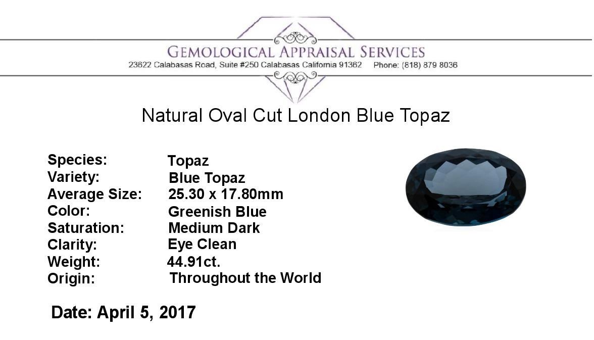 One natural oval cut london blue topaz with an exact weight of 44.91ct., clarity is eye clean, greenish blue, medium dark. Gemological Appraisals Services estimates the retail value at $898.2 GAS Appraised.