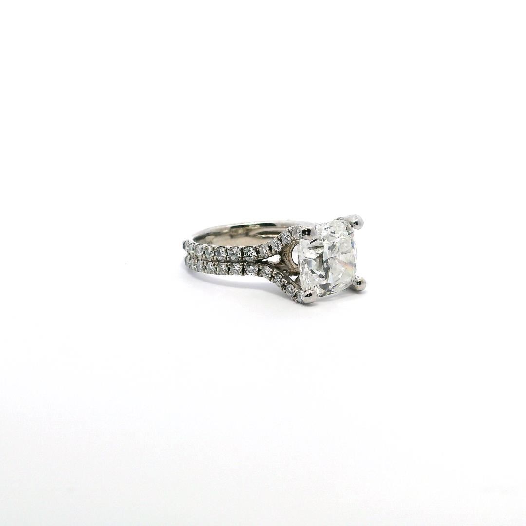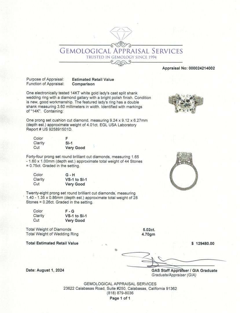 This ring features a stunning 4.01ct cushion cut diamond with SI-1 clarity and F color. Expert craftsmanship and EGL certified! One electronically tested 14KT white gold lady's cast split shank wedding ring with a diamond gallery with a bright polish finish. Condition is new, good workmanship. The featured lady's ring has a double shank measuring 3.60 millimeters in width. Identified with markings of 14K. Containing: One prong set cushion cut diamond, measuring 9.24 x 9.12 x 6.27mm (depth est.) approximate weight of 4.01ct. EGL USA Laboratory Report # US 925891501D. Color: F Clarity: SI-1 Cut: Very Good Forty-four prong set round brilliant cut diamonds, measuring 1.65 - 1.60 x 1.00mm (depth est.) approximate total weight of 44 Stones = 0.75ct. Graded in the setting. Color: G-H Clarity: VS-1 to SI-1 Cut: Very Good Twenty-eight prong set round brilliant cut diamonds, measuring 1.40 - 1.35 x 0.86mm (depth est.) approximate total weight of 28 Stones = 0.26ct. Graded in the setting. Color: F-G Clarity: VS-1 to SI-1 Cut: Very Good Total Weight of Diamonds: 5.02ct. Total Weight of Wedding Ring: 4.70gm Total Estimated Retail Value: $129480.00 Appraisal No: 000024214002