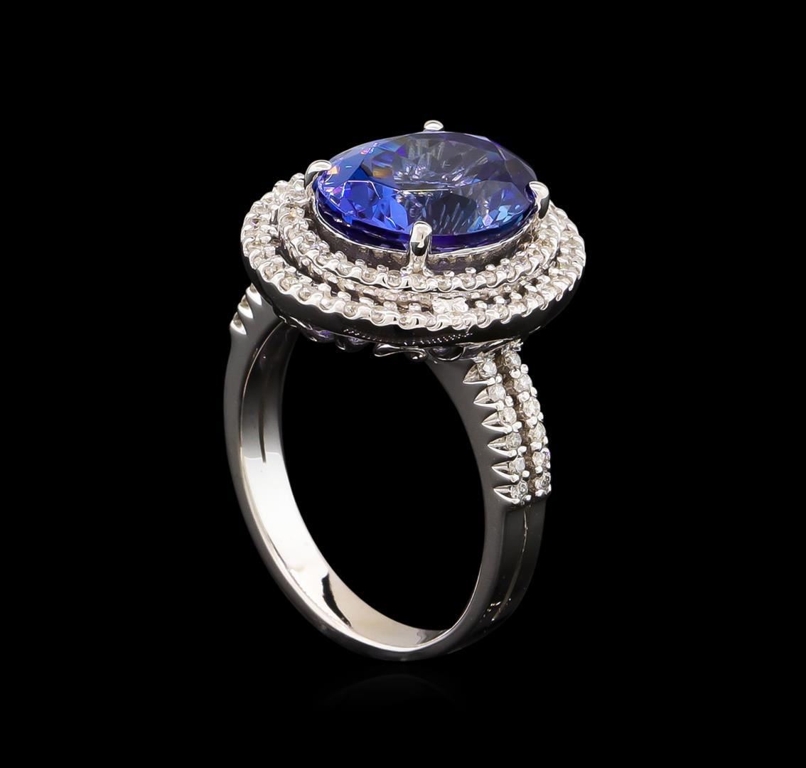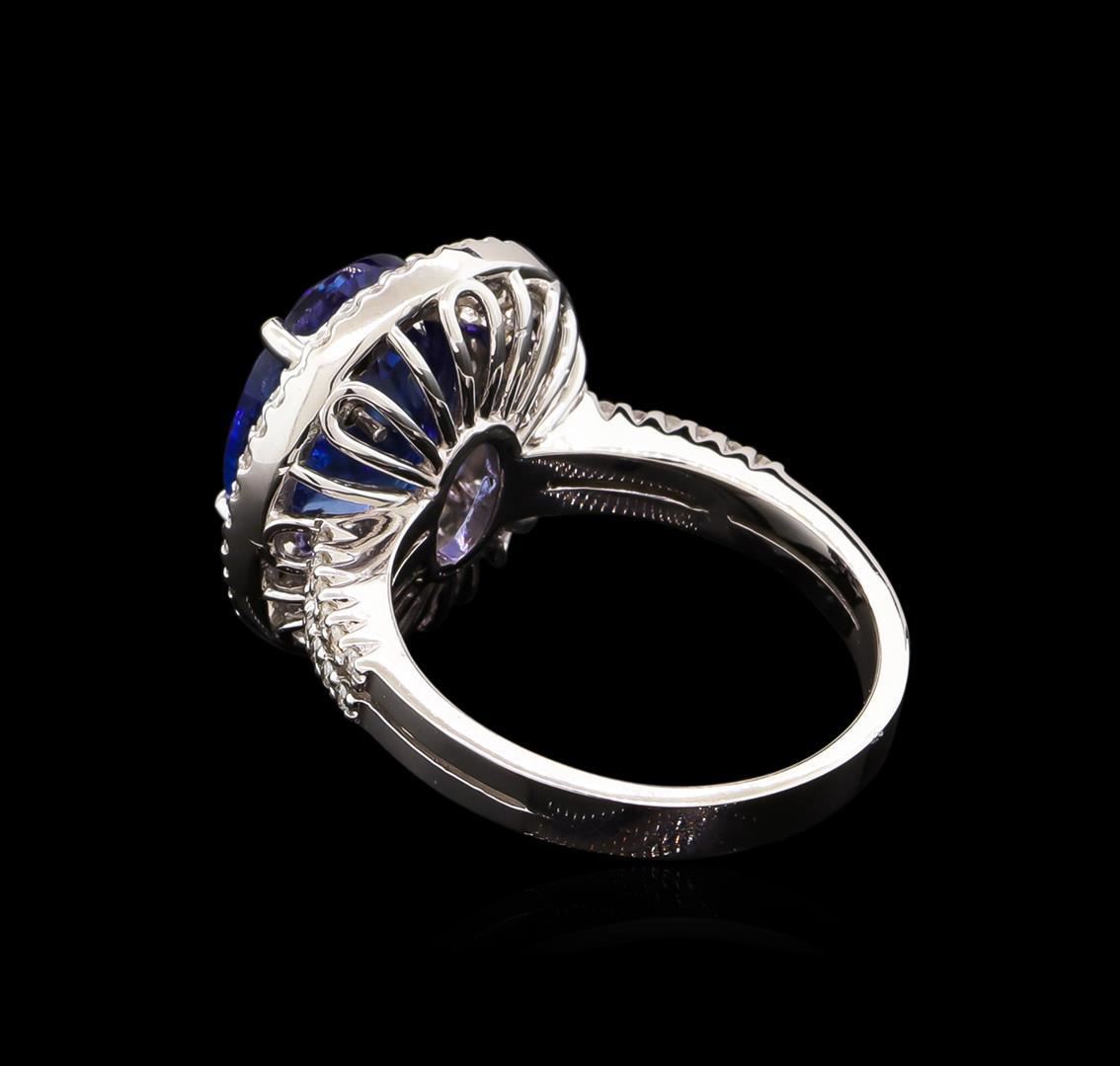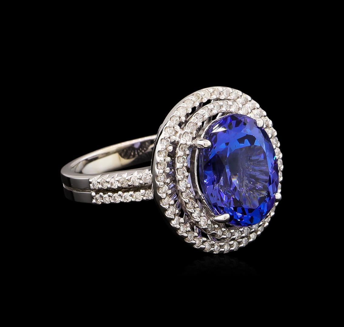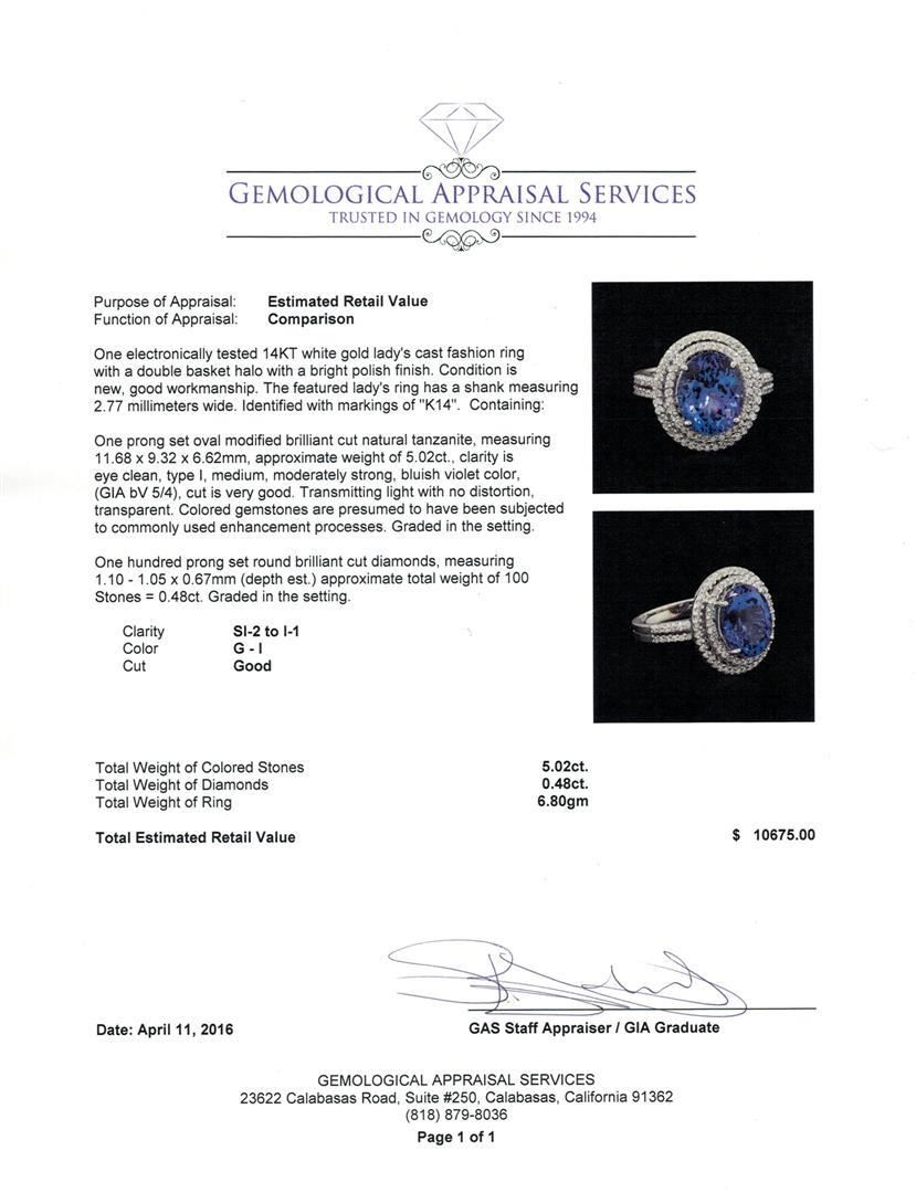 One electronically tested 14KT white gold lady's cast fashion ring with a double basket halo with a bright polish finish. The featured lady's ring has a shank measuring 2.77 millimeters wide. Identified with markings of "K14". Condition is new, good workmanship. Containing: One prong set oval modified brilliant cut natural tanzanite, measuring 11.68 x 9.32 x 6.62mm, approximate weight of 5.02ct., clarity is eye clean, type I, medium, moderately strong, bluish violet color, (GIA bV 5/4), cut is very good. Transmitting light with no distortion, transparent. Colored gemstones are presumed to have been subjected to commonly used enhancement processes. Graded in the setting. One Hundred prong set round brilliant cut diamonds, measuring 1.10 - 1.05 x 0.67mm (depth est.) approximate total weight of 100 Stones = 0.48ct. Graded in the setting. Clarity: SI-2 to I-1. Color: G - I. Cut Good. Total Weight of Colored Stones 5.02ct. Total Weight of Diamonds 0.48ct. Total Weight of Ring 6.80gm. GAS Appraised.