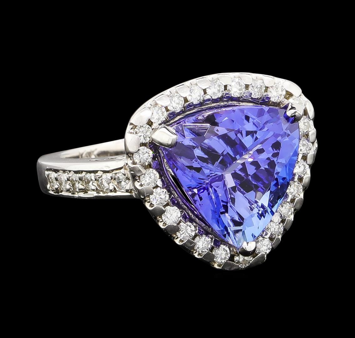 One electronically tested 14KT white gold lady's cast fashion ring with a cathedral shank with a halo with a bright polish finish. The featured lady's ring has a shank measuring 2.33 millimeters wide. Identified with markings of '14K'. Condition is new, good workmanship. Containing: One prong set triangle modified brilliant cut natural tanzanite, measuring 11.10 x 10.70 x 7.38mm, (depth est.) approximate weight of 5.05ct., clarity is eye clean, medium dark, moderately strong, bluish violet color, (GIA bV 6/4), cut is very good. Transmitting light with no distortion, transparent. Colored gemstones are presumed to have been subjected to commonly used enhancement processes. Graded in the setting. Thirty-Six prong set round brilliant cut diamonds, measuring 1.55 - 1.45 x 0.92mm (depth est.) approximate total weight of 36 Stones = 0.45ct. Graded in the setting. Clarity SI-1 to I-1. Color: H - I Cut Good. Total Weight of Colored Stones 5.05ct.. Total Weight of Diamonds 0.45ct.. Total Weight of Ring 7.40gm. GAS Appraised at $9,240.00.