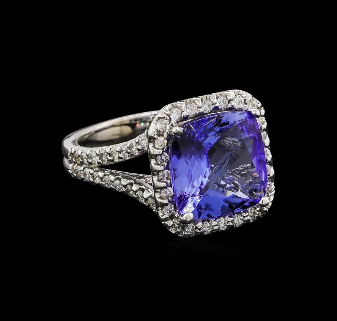 One electronically tested 14KT white gold lady's cast fashion ring with a split shank halo with a bright polish finish. The featured lady's ring has a double shank measuring 2.74 millimeters wide. Identified with markings of '14K'. Condition is new, good workmanship. Containing: One prong set square cushion modified brilliant cut natural tanzanite, measuring 10.68 x 10.64 x 5.48mm, (depth est.) 3%. bulge factor, approximate weight of 5.06ct., clarity is eye clean, medium, moderately strong, violet color, (GIA V 5/4), cut is good. Transmitting light with no distortion, transparent. Colored gemstones are presumed to have been subjected to commonly used enhancement processes. Graded in the setting. Fifty-Six prong set round brilliant cut diamonds, measuring 1.40 - 1.35 x 0.86mm (depth est.) approximate total weight of 56 Stones = 0.55ct. Graded in the setting. Clarity SI-1 to I-1. Color: G - I Cut Good. Total Weight of Colored Stones 5.06ct.. Total Weight of Diamonds 0.55ct.. Total Weight of Ring 7.00gm GAS Appraised at $9,410.00.
