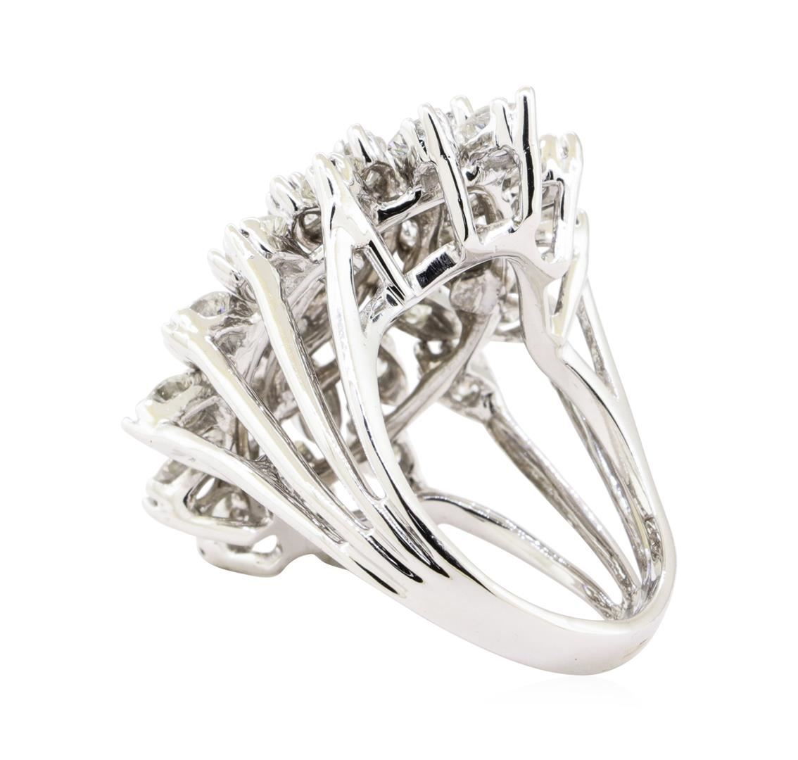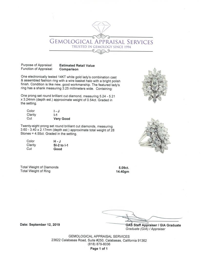 One electronically tested 14KT white gold lady's combination cast & assembled fashion ring with a wire basket halo with a bright polish finish. The featured lady's ring has a shank measuring 3.25 millimeters wide. Condition is Good. Containing: One prong set round brilliant cut diamond, measuring 5.24 - 5.21 x 3.24mm (depth est.) approximate weight of 0.54ct. Graded in the setting. Color I - J Clarity I-1 Cut Very Good Twenty-Eight prong set round brilliant cut diamonds, measuring 3.60 - 3.40 x 2.17mm (depth est.) approximate total weight of 28 Stones = 4.55ct. Graded in the setting. Color H - J Clarity SI-2 to I-1 Cut Good. Total Weight of Diamonds 5.09ct.. Total Weight of Ring 14.40gm GAS Appraised at $15495.00. GAS Appraised.