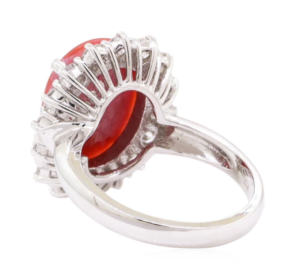 One electronically tested 14KT white gold lady's cast fashion ring with a oval halo with a bright polish finish. The featured lady's ring has a shank measuring 2.60 millimeters wide. Identified with markings of 'K14'. Condition is new, good workmanship. Containing: One prong set oval cabochon standard cut natural red coral, measuring 14.99 x 10.90 x 3.18mm, (depth est.) 20%. bulge factor, approximate weight of 3.95ct., medium, slightly brownish, orangy red color, (GIA oR 5/2), cut is good. Colored gemstones are presumed to have been subjected to commonly used enhancement processes. Graded in the setting. Sixteen prong set round brilliant cut diamonds, measuring 2.70 - 2.60 x 1.64mm (depth est.) approximate total weight of 16 Stones = 1.15ct. Graded in the setting. Color G - H Clarity VS-2 to SI-2 Cut Very Good. Total Weight of Colored Stones 3.95ct.. Total Weight of Diamonds 1.15ct.. Total Weight of Ring 6.00gm GAS Appraised at $5105.00. GAS Appraised.