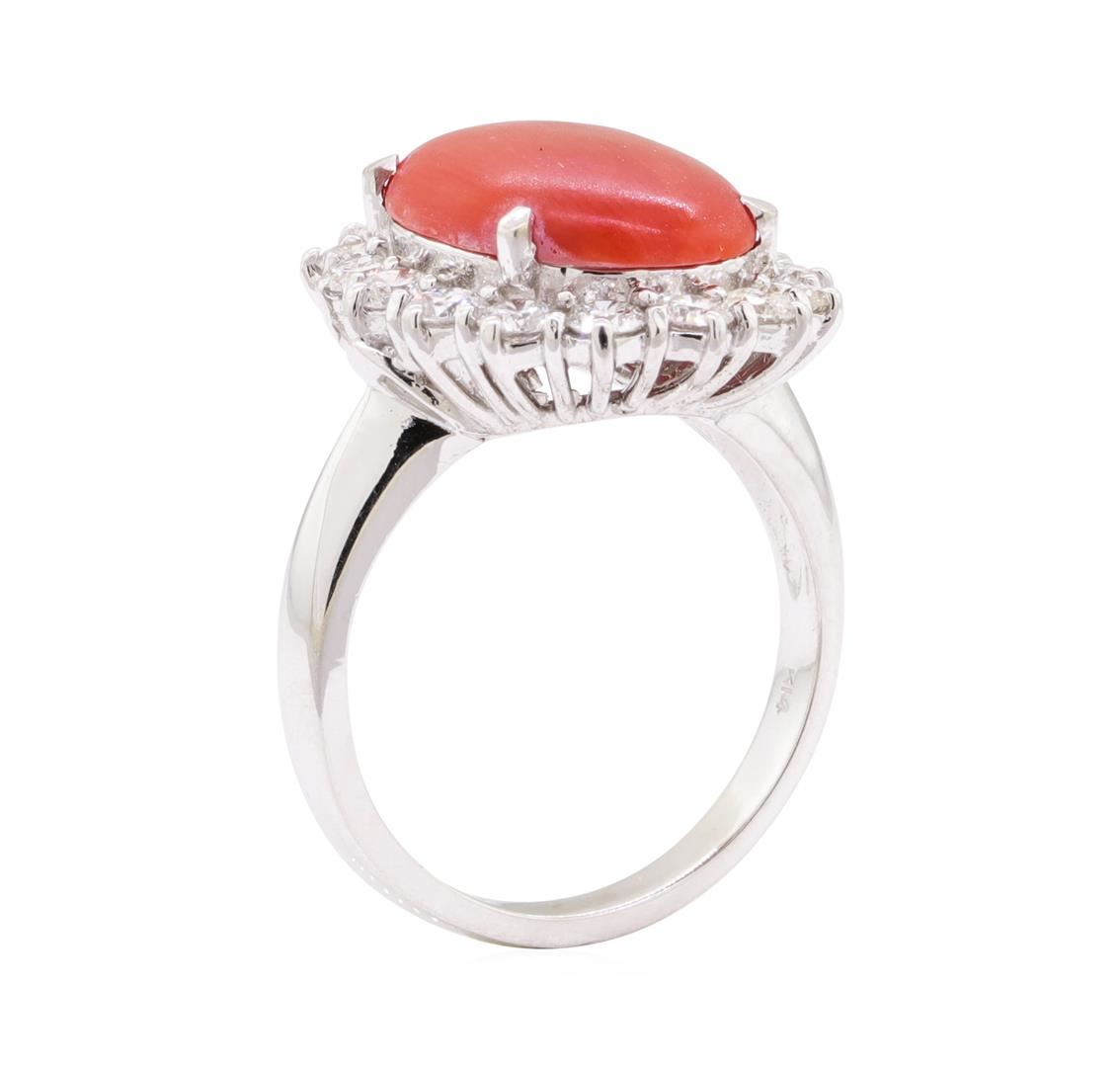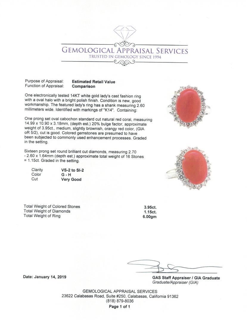 One electronically tested 14KT white gold lady's cast fashion ring with a oval halo with a bright polish finish. The featured lady's ring has a shank measuring 2.60 millimeters wide. Identified with markings of 'K14'. Condition is new, good workmanship. Containing: One prong set oval cabochon standard cut natural red coral, measuring 14.99 x 10.90 x 3.18mm, (depth est.) 20%. bulge factor, approximate weight of 3.95ct., medium, slightly brownish, orangy red color, (GIA oR 5/2), cut is good. Colored gemstones are presumed to have been subjected to commonly used enhancement processes. Graded in the setting. Sixteen prong set round brilliant cut diamonds, measuring 2.70 - 2.60 x 1.64mm (depth est.) approximate total weight of 16 Stones = 1.15ct. Graded in the setting. Color G - H Clarity VS-2 to SI-2 Cut Very Good. Total Weight of Colored Stones 3.95ct.. Total Weight of Diamonds 1.15ct.. Total Weight of Ring 6.00gm GAS Appraised at $5105.00. GAS Appraised.