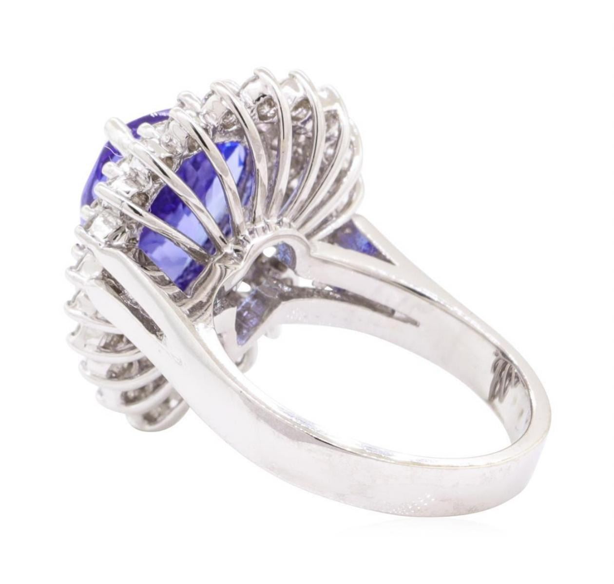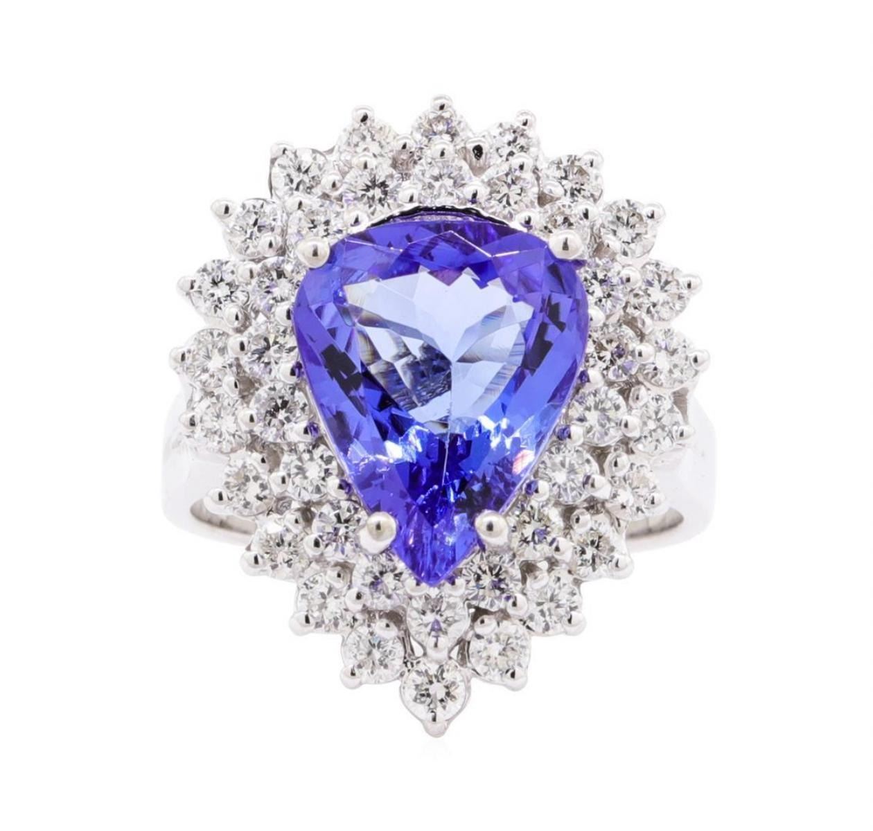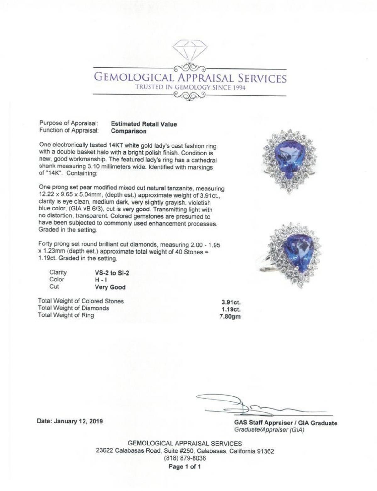 One electronically tested 14KT white gold lady's cast fashion ring with a double basket halo with a bright polish finish. The featured lady's ring has a cathedral shank measuring 3.10 millimeters wide. Identified with markings of '14K'. Condition is new, good workmanship. Containing: One prong set pear modified mixed cut natural tanzanite, measuring 12.22 x 9.65 x 5.04mm, (depth est.) approximate weight of 3.91ct., clarity is eye clean, medium dark, very slightly grayish, violetish blue color, (GIA vB 6/3), cut is very good. Transmitting light with no distortion, transparent. Colored gemstones are presumed to have been subjected to commonly used enhancement processes. Graded in the setting. Forty prong set round brilliant cut diamonds, measuring 2.00 - 1.95 x 1.23mm (depth est.) approximate total weight of 40 Stones = 1.19ct. Graded in the setting. Color H - I Clarity VS-2 to SI-2 Cut Very Good. Total Weight of Colored Stones 3.91ct.. Total Weight of Diamonds 1.19ct.. Total Weight of Ring 7.80gm GAS Appraised at $9405.00. GAS Appraised.