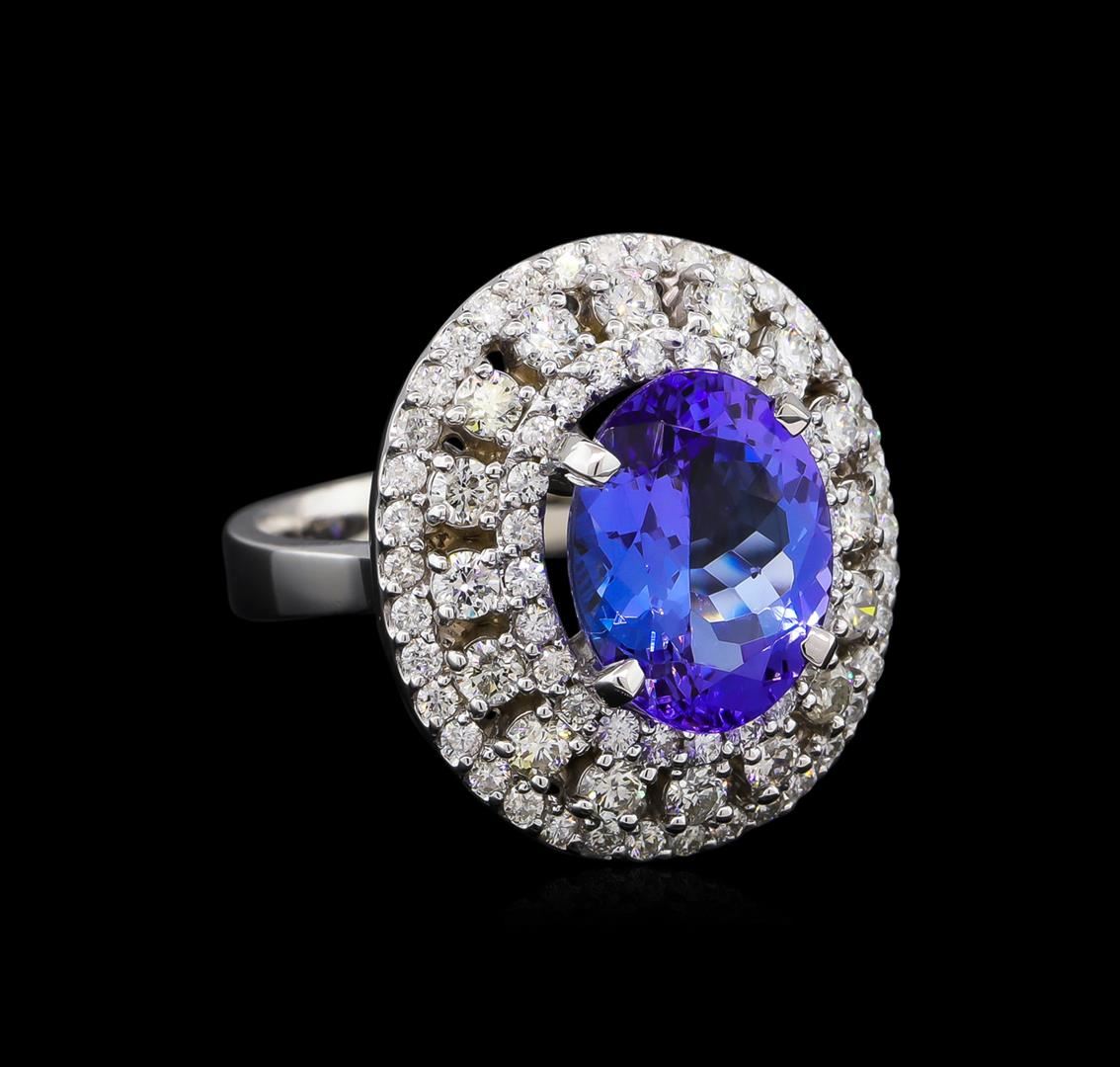 One electronically tested 14KT white gold lady's cast fashion ring with a triple basket halo with a bright polish finish. The featured lady's ring has a shank measuring 4.07 millimeters wide. Identified with markings of "K14". Condition is new, good workmanship. Containing: One prong set oval modified brilliant cut natural tanzanite, measuring 12.70 x 9.90 x 5.98mm, approximate weight of 5.12ct., clarity is eye clean, type I, medium, moderately strong, violetish blue color, (GIA vB 5/4), cut is good. Transmitting light with no distortion, transparent. Colored gemstones are presumed to have been subjected to commonly used enhancement processes. Graded in the setting. Sixteen prong set round brilliant cut diamonds, measuring 2.40 - 2.30 x 1.46mm (depth est.) approximate total weight of 16 Stones = 0.80ct. Graded in the setting. Clarity: SI-1 to SI-2. Color: G - I. Cut Good Sixty-Two prong set round brilliant cut diamonds, measuring 1.50 - 1.40 x 0.90mm (depth est.) approximate total weight of 62 Stones = 0.72ct. Graded in the setting. Clarity: SI-1 to SI-2. Color: H - I. Cut Good. Total Weight of Colored Stones 5.12ct. Total Weight of Diamonds 1.52ct. Total Weight of Ring 10.70gm. GAS Appraised at $13,355.00.